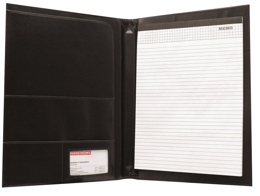 En praktisk och stilfull konferensmapp i svart konstläder.