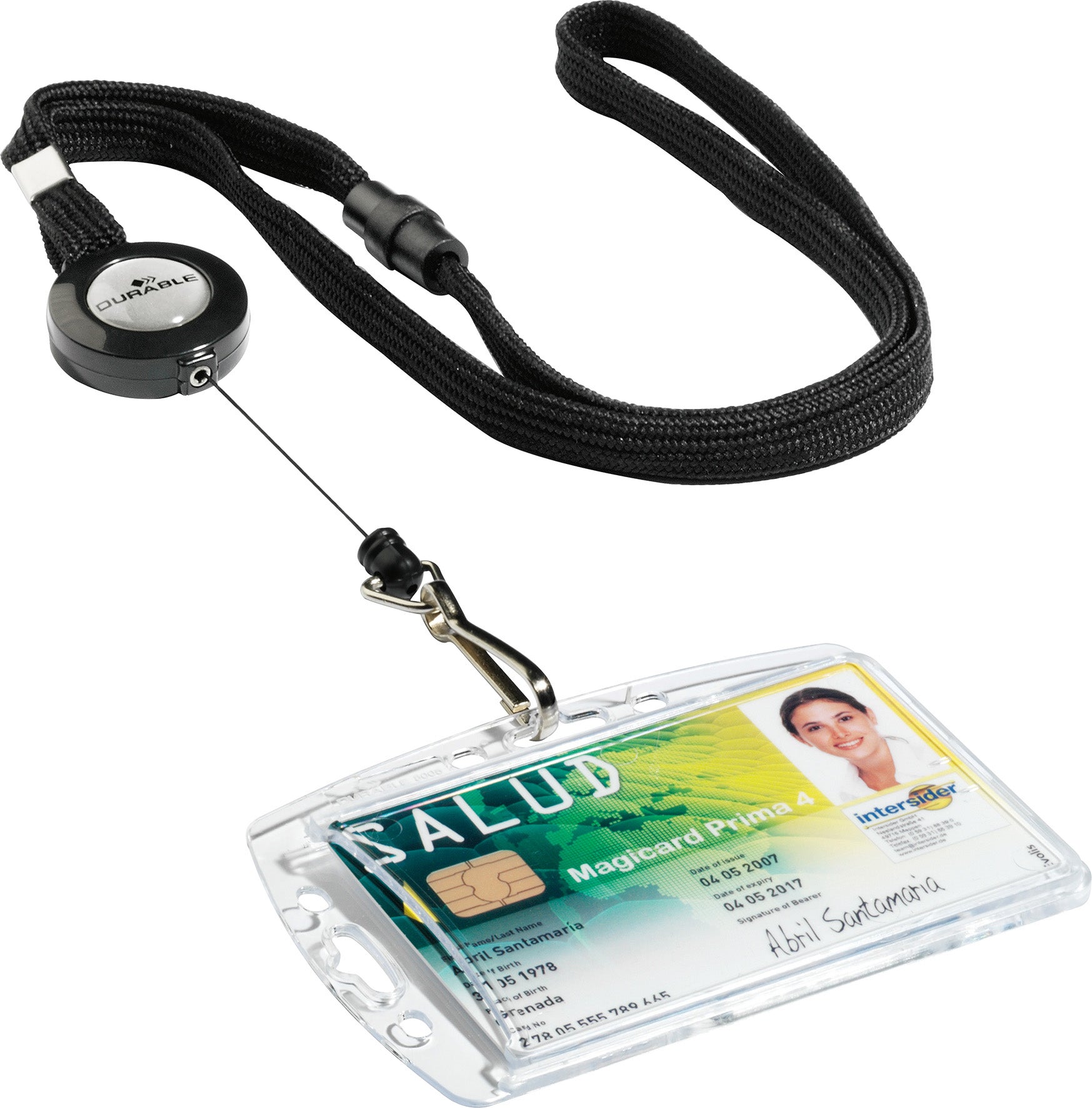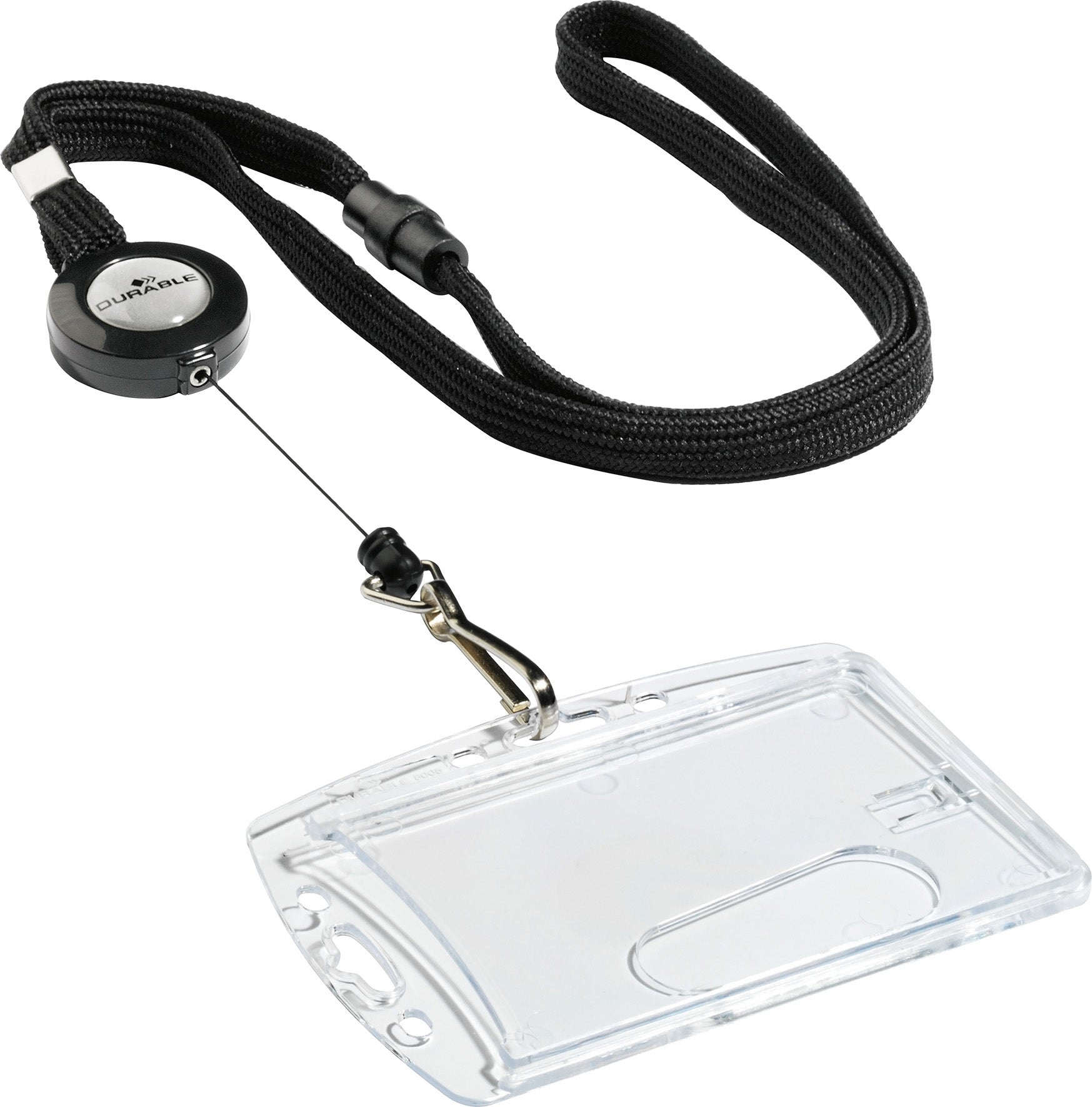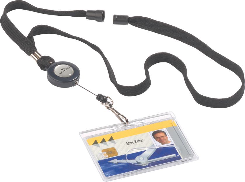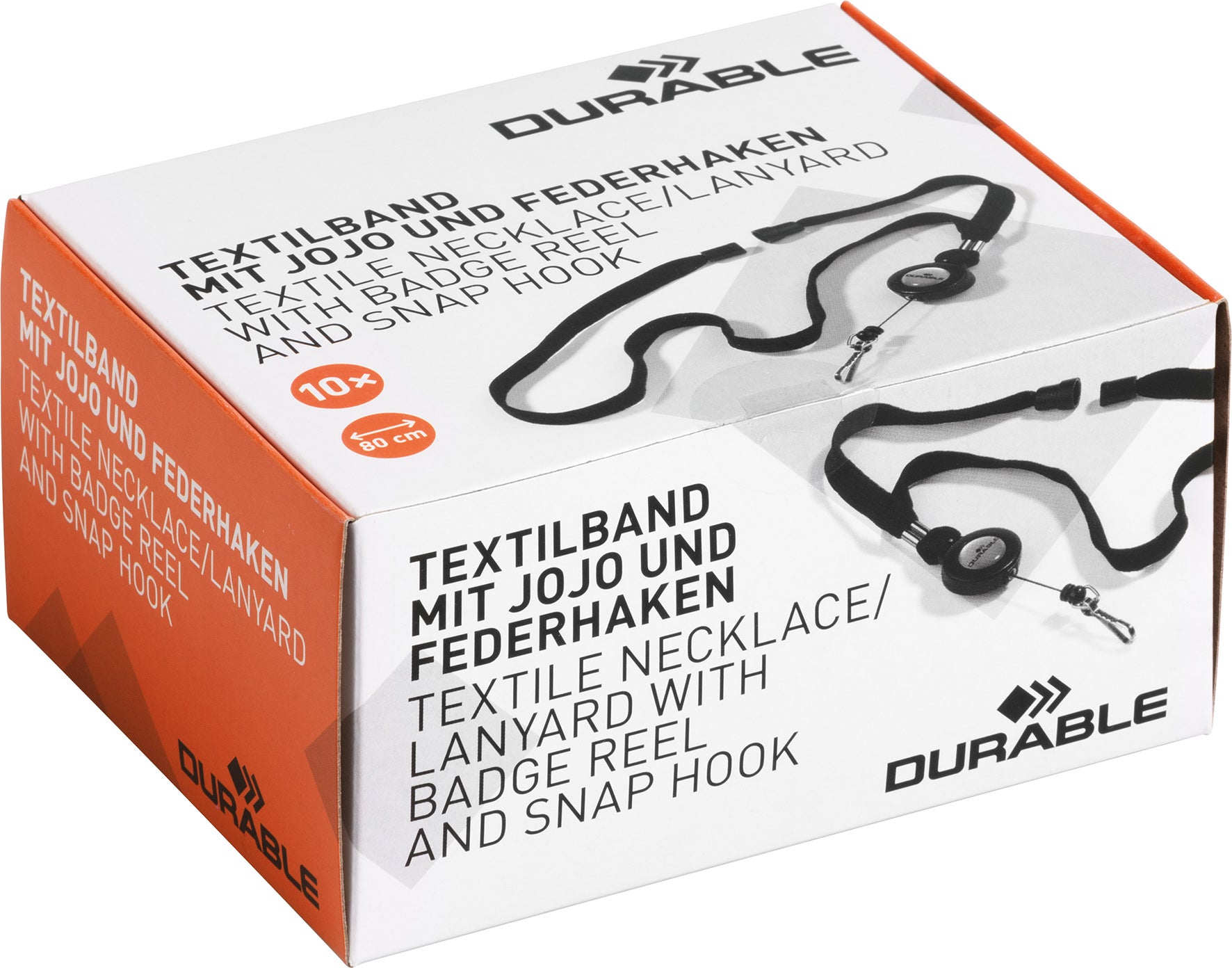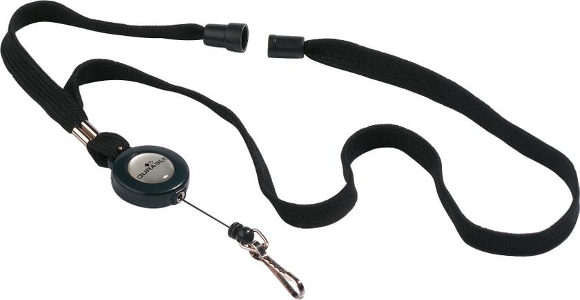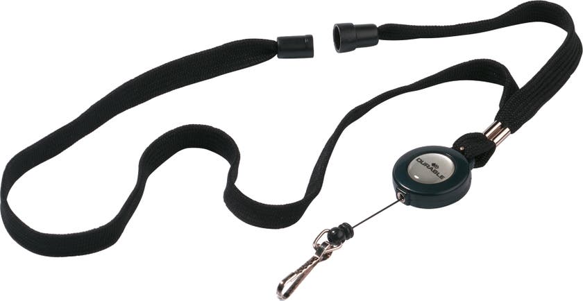 Textilhalsband med jojo och säkerhetsspänne som öppnas vid för stark belastning. Jojo med hake för namnskyltar och ID-korthållare. Bandlängd: 44 cm, bredd: 1 cm. Längd jojo: 80 cm.