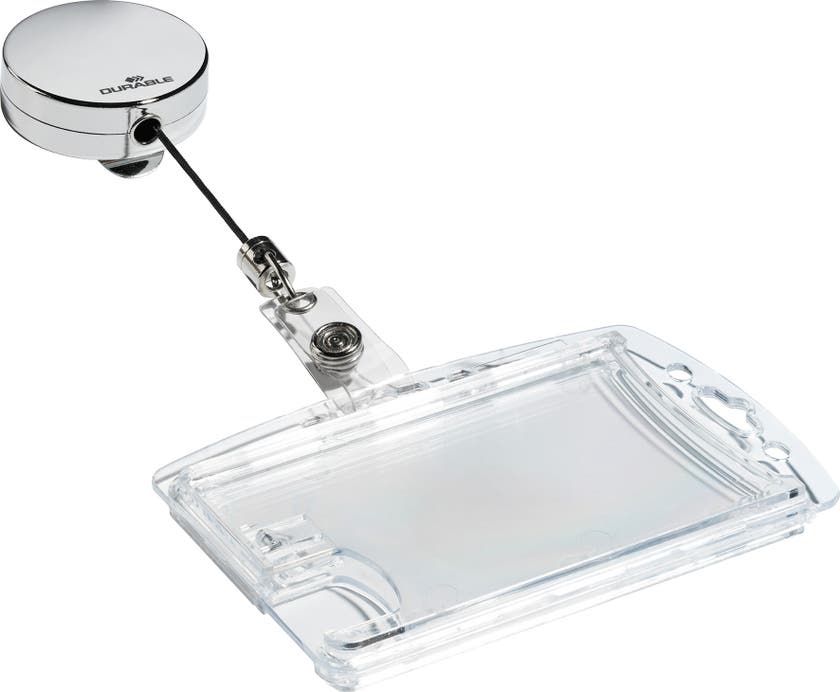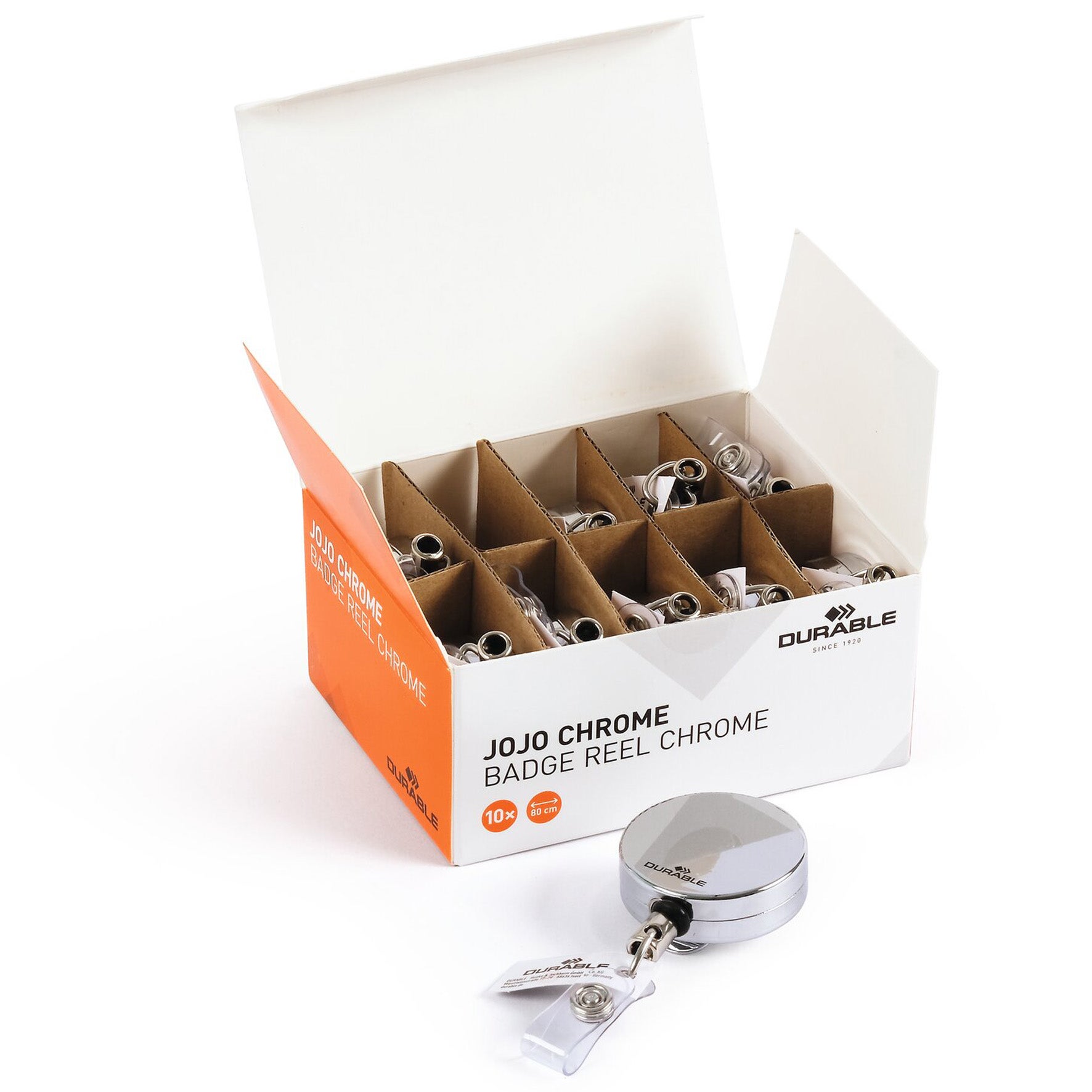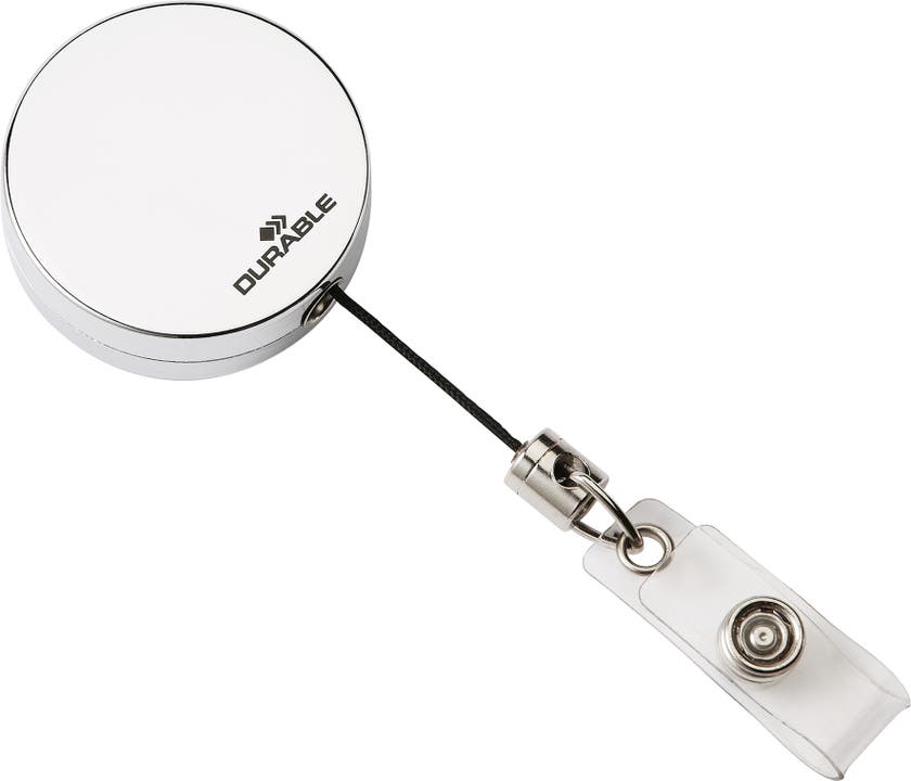Praktisk jojo med knäppfäste för t ex namnskyltar och passerkorthållare. Utdragbar nylonlina upp till 80 cm. Rejäl hållare av kromad metall med metallclips på baksidan för fastsättning i t ex byxlinnningen.