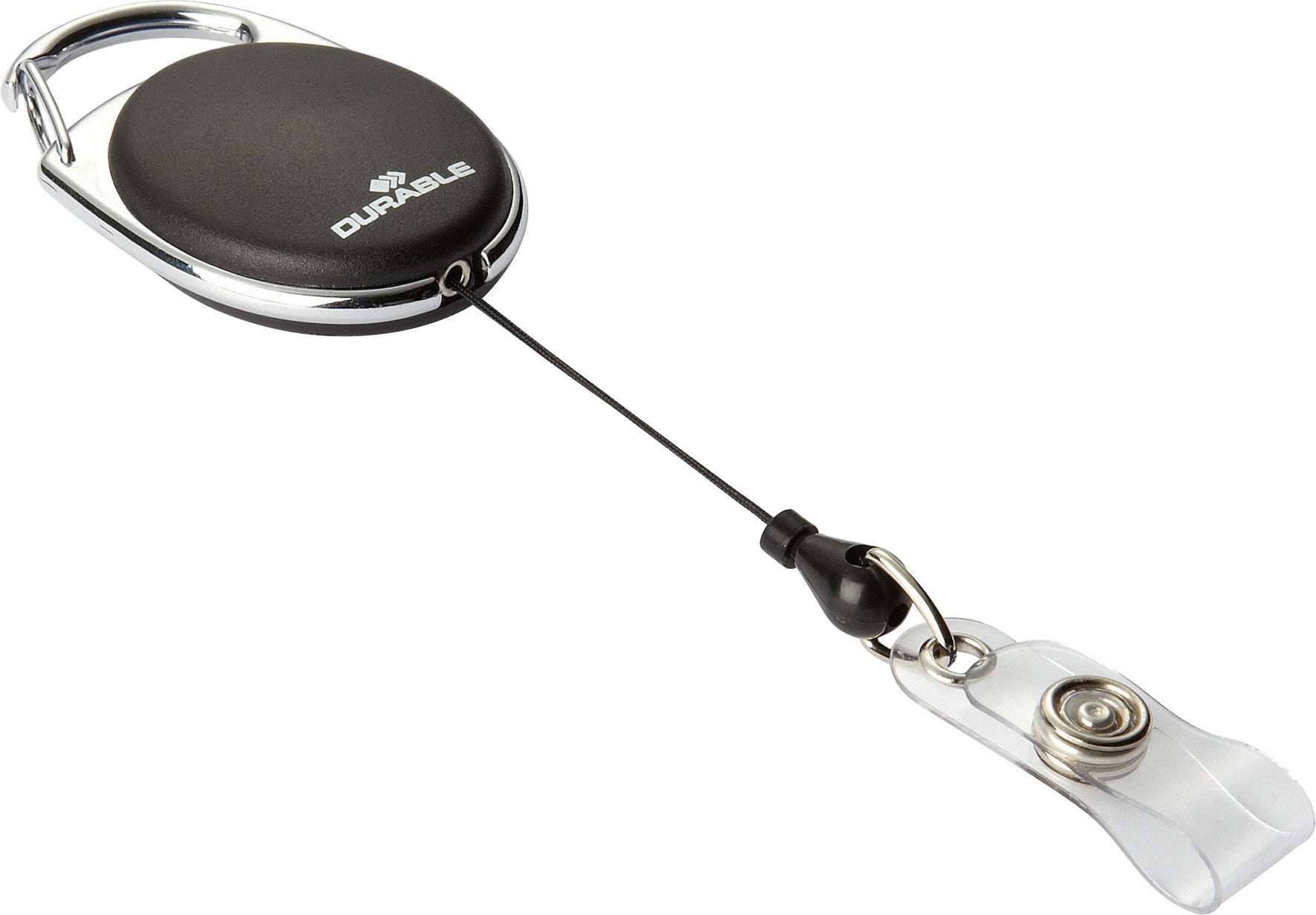 Stilren jojo i oval form med knäppfäste för t ex namnskyltar och passerkorthållare. Utdragbar nylonlina upp till 80 cm. Med hake av metall som kan hakas fast i en byxhälla.