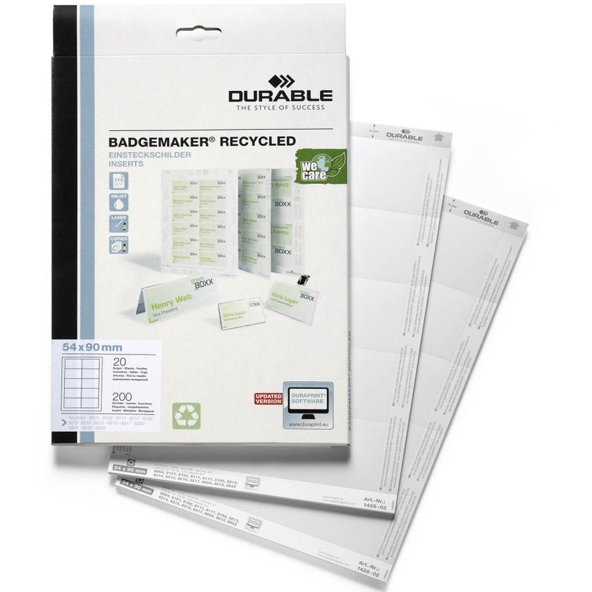 Skapa enkelt etiketter till dina namnskyltar med dessa BADGEMAKER® etikettark med DURAPRINT® som finns på www.duraprint.se. Skriv enkelt ut dem med en laser- eller inkjet skrivare. Smidiga måttanpassade etiketter från Durable som är tillverkade av ett tåligt helt återvunnet 150 g papper. Etiketterna är stansade för att passa perfekt i namnskyltar och namnbrickor av matchande storlek, med sin microperforering är de enkla att dela på.