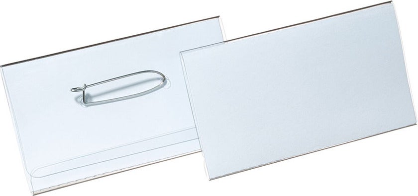 Namnskylt med nål i transparent plast, med neutrala utbytbara insticksetiketter.