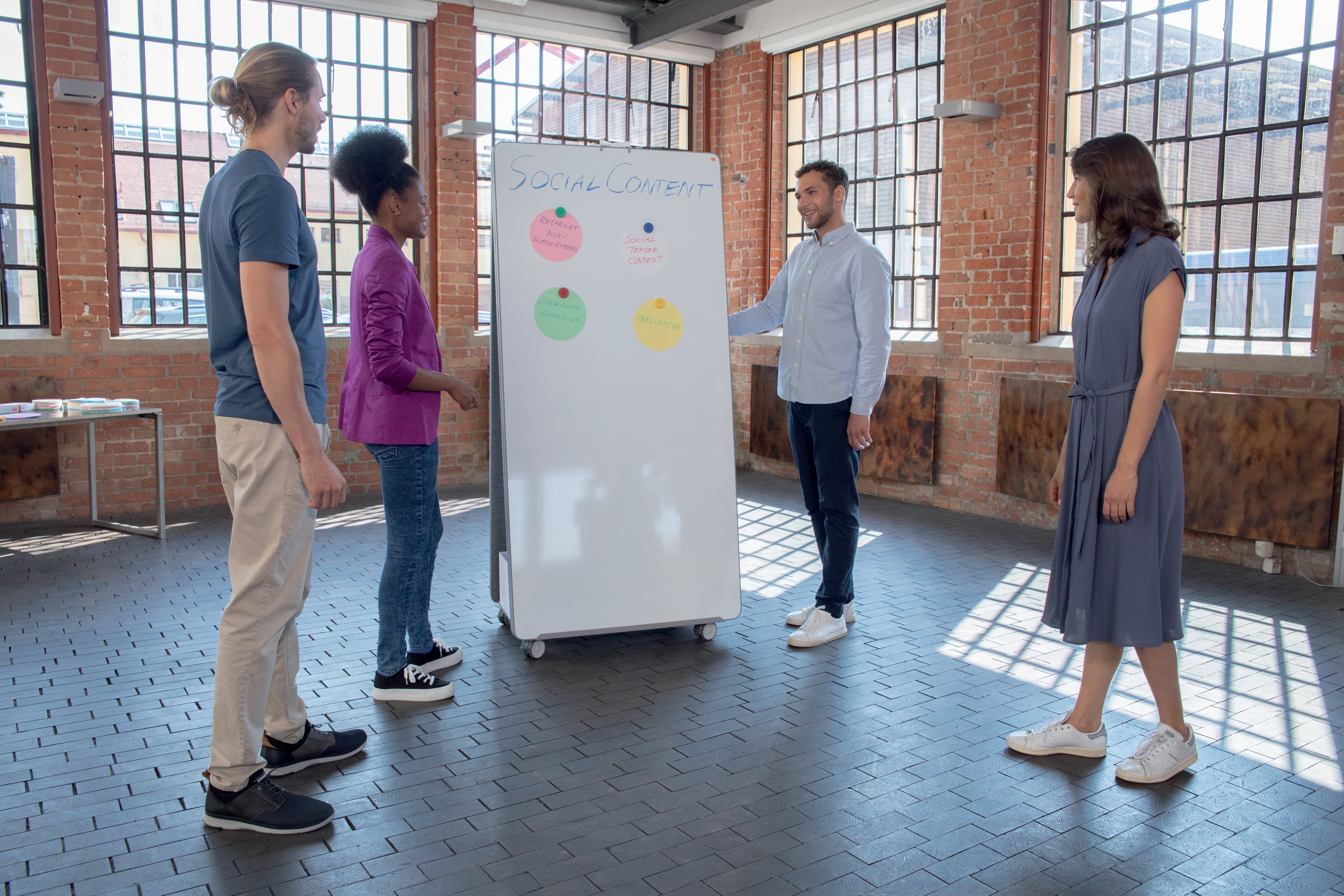 Mobil Whiteboard Move & Meet. Det mobila whiteboardsystemet Move & Meet erbjuder ultimat flexibilitet i alla arbetsmiljöer. Enkelt konfigurerade för att uppfylla dina behov. Denna lätta, bärbara och dubbelsidiga whiteboardtavla har en magnetisk yta och är det perfekta komplementet till systemet eftersom den ger dig ytterligare två skrivytor. Whiteboardtavlan har en stilren hörndesign med mjuk ram i grå nyans som passar in i de flesta miljöer.