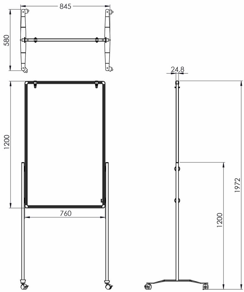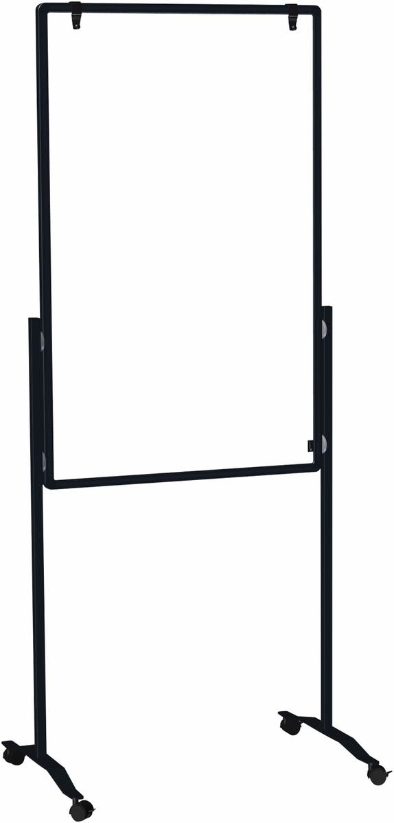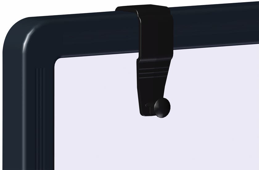 Med blå filtyta på ena sidan och whiteboard på den andra. Whiteboard-sidan är magnetisk och har en avtagbar magnetisk blädderblockshållare.