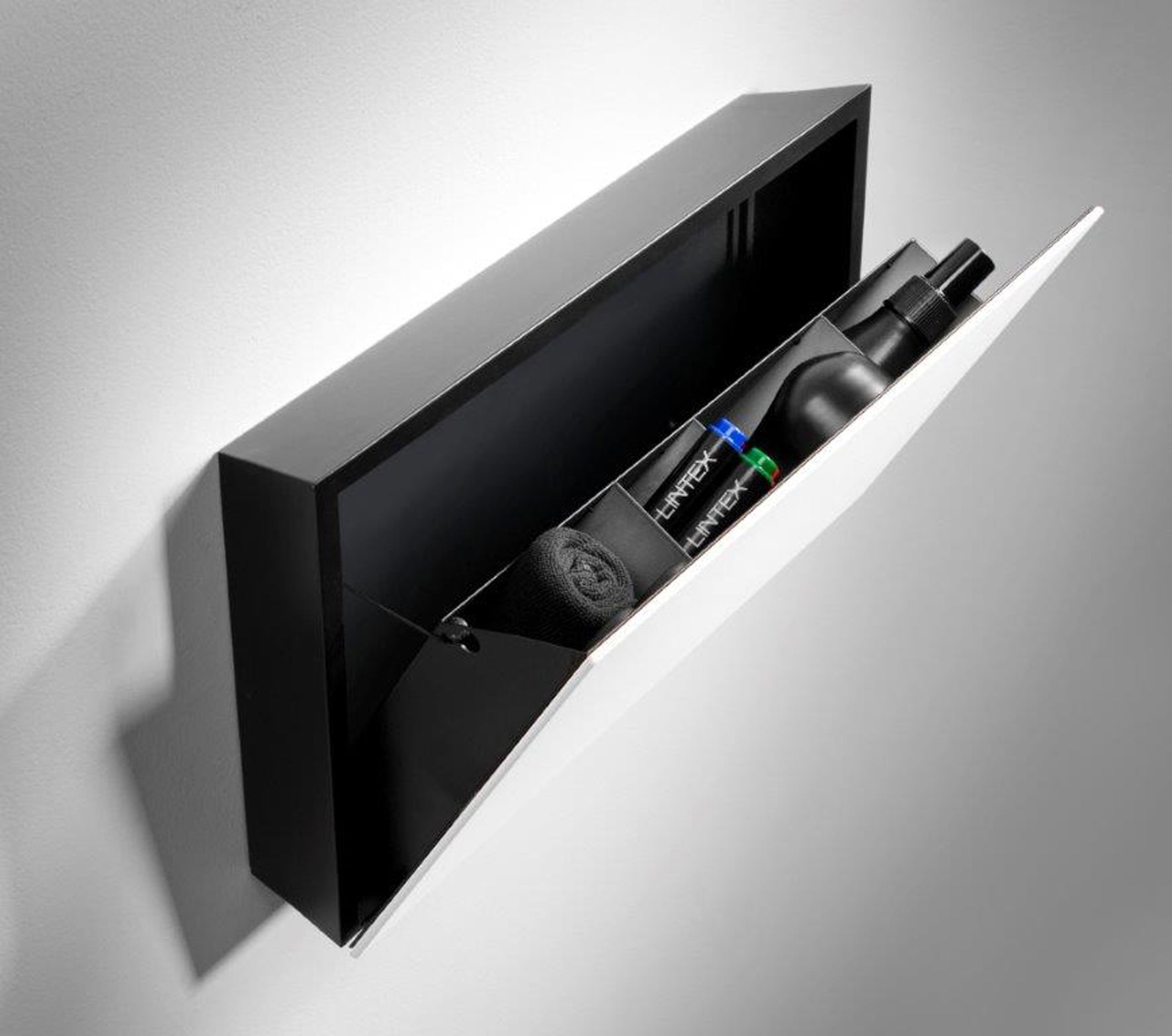 Boxen har vit glasfront i standardutförande men kan också beställas i alla Moods 24 färger.