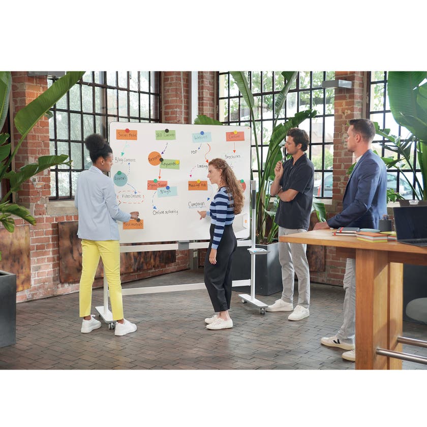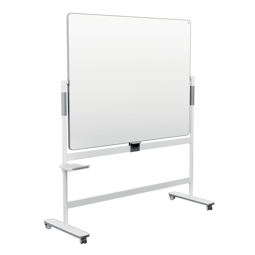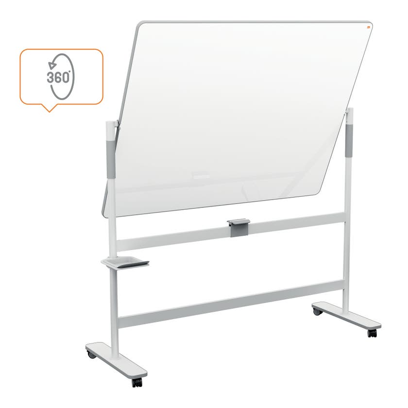 Dubbelsidig, vridbar whiteboardtavla Move & Meet från Nobo – det perfekta mobila samarbetsverktyget när det gäller att skapa och dela idéer i olika team. Stilren och rundad hörndesign och mycket lätt att flytta mellan olika platser. Den magnetiska whiteboardtavlan i stål kan vändas runt i 360 grader för enkel användning av båda sidor och för större skrivområde. Tavlan torkas enkelt ren med en torr trasa.