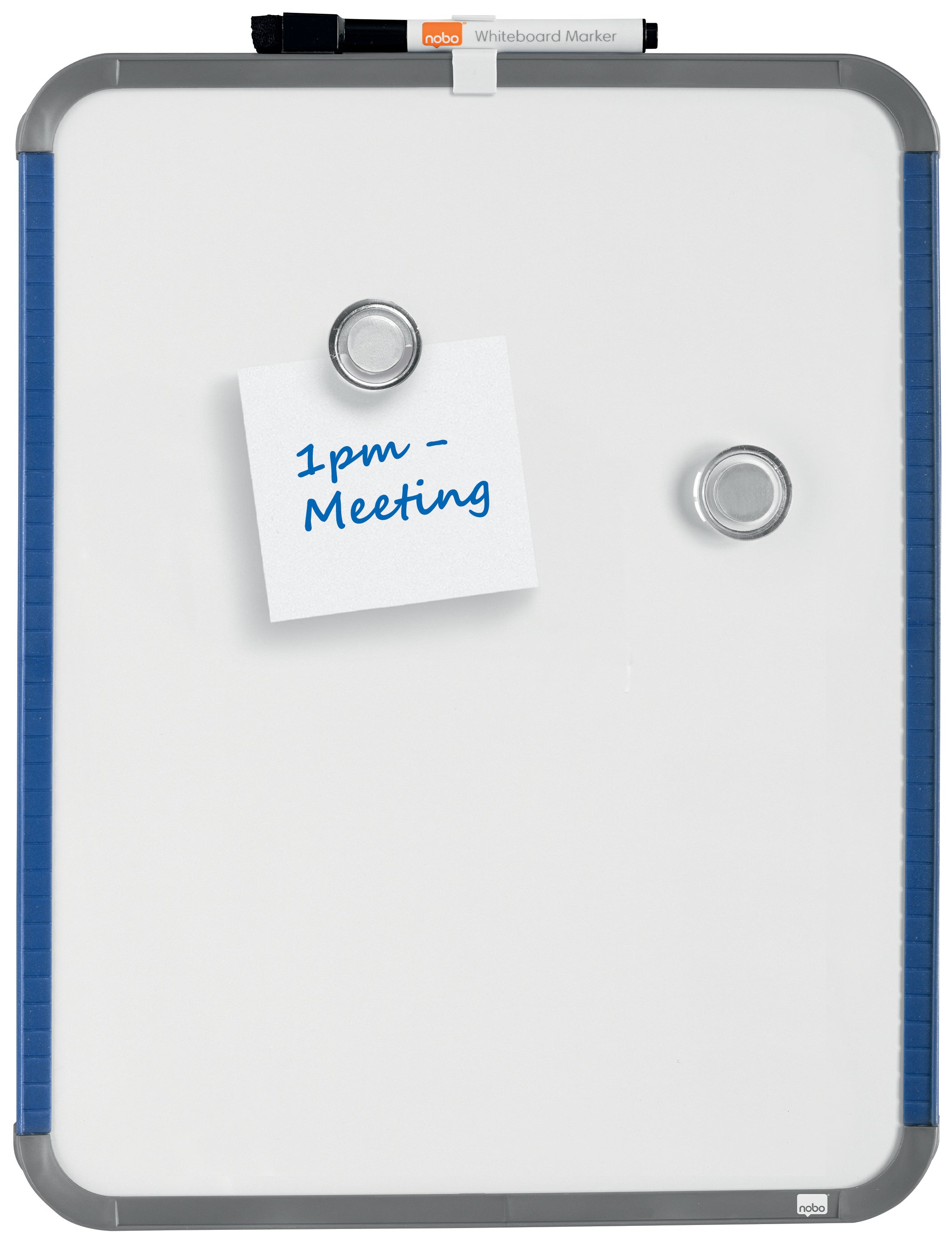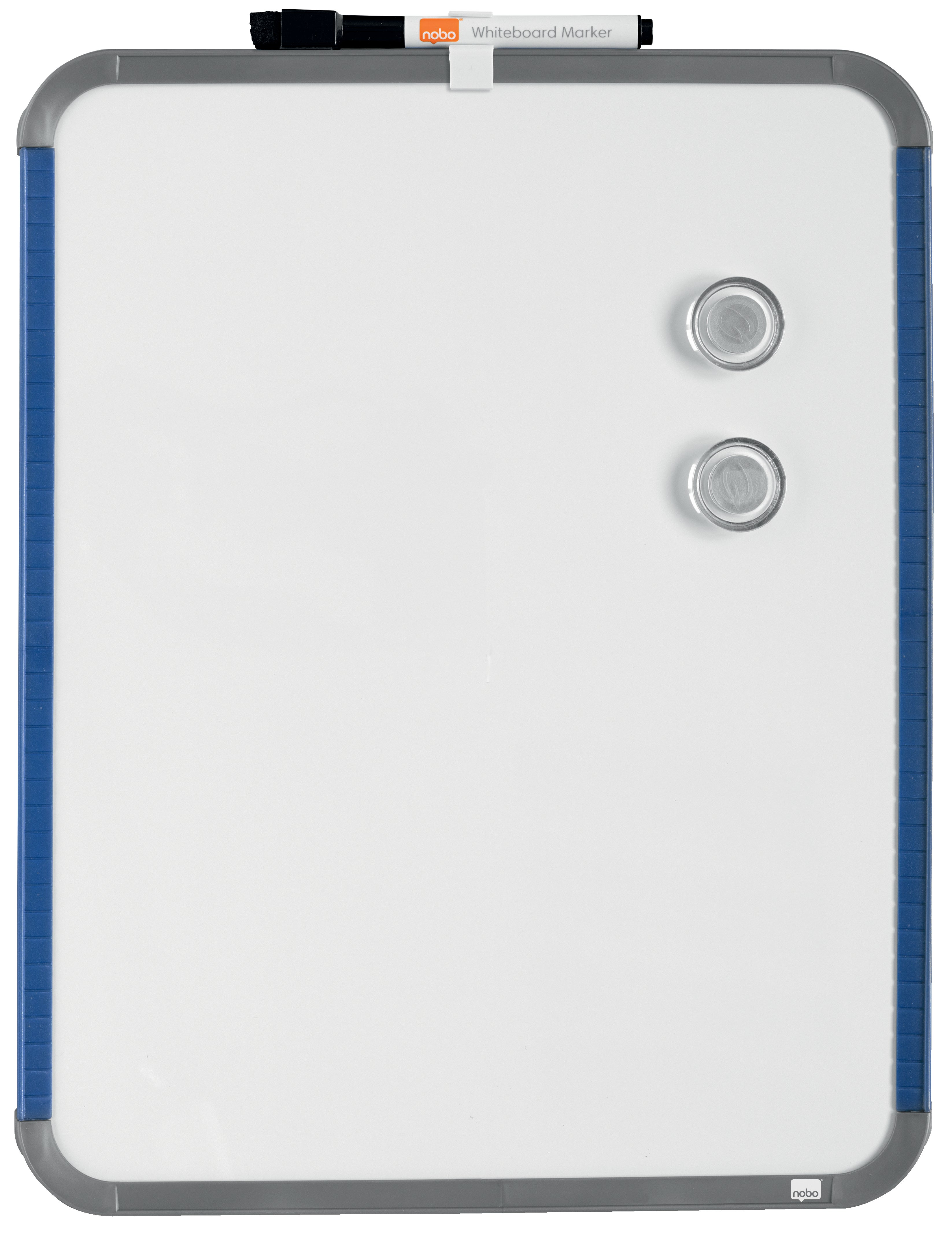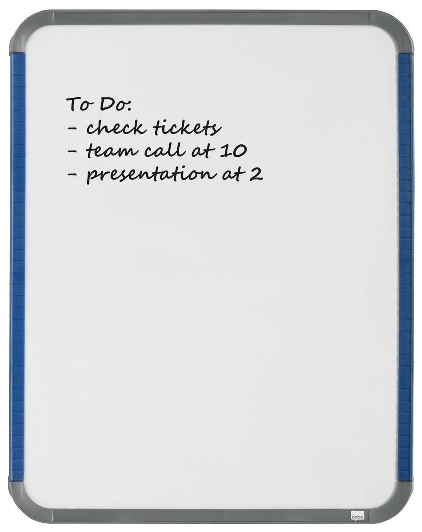 Whiteboard Slim Nobo lackerad. Slimline magnetiska whiteboards för hem- eller kontorsanvändning. Idealisk för anteckningar, listor, meddelanden och levereras med en whiteboardpenna, två magneter och fästkuddar för permanent fastsättning. Vitmålad magnetisk stålplåt ger en bra raderbarhet vid måttlig användning.