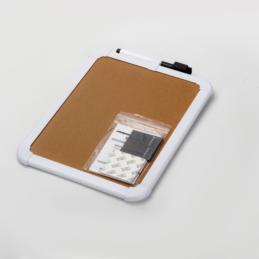 Två magneter och penna med inbyggd taveltorkare ingår.