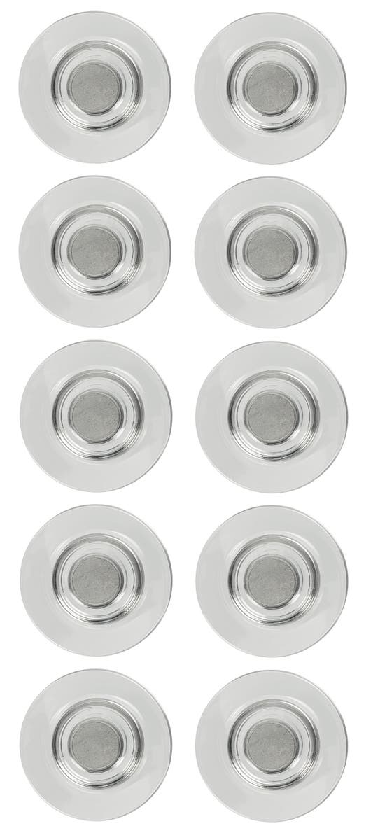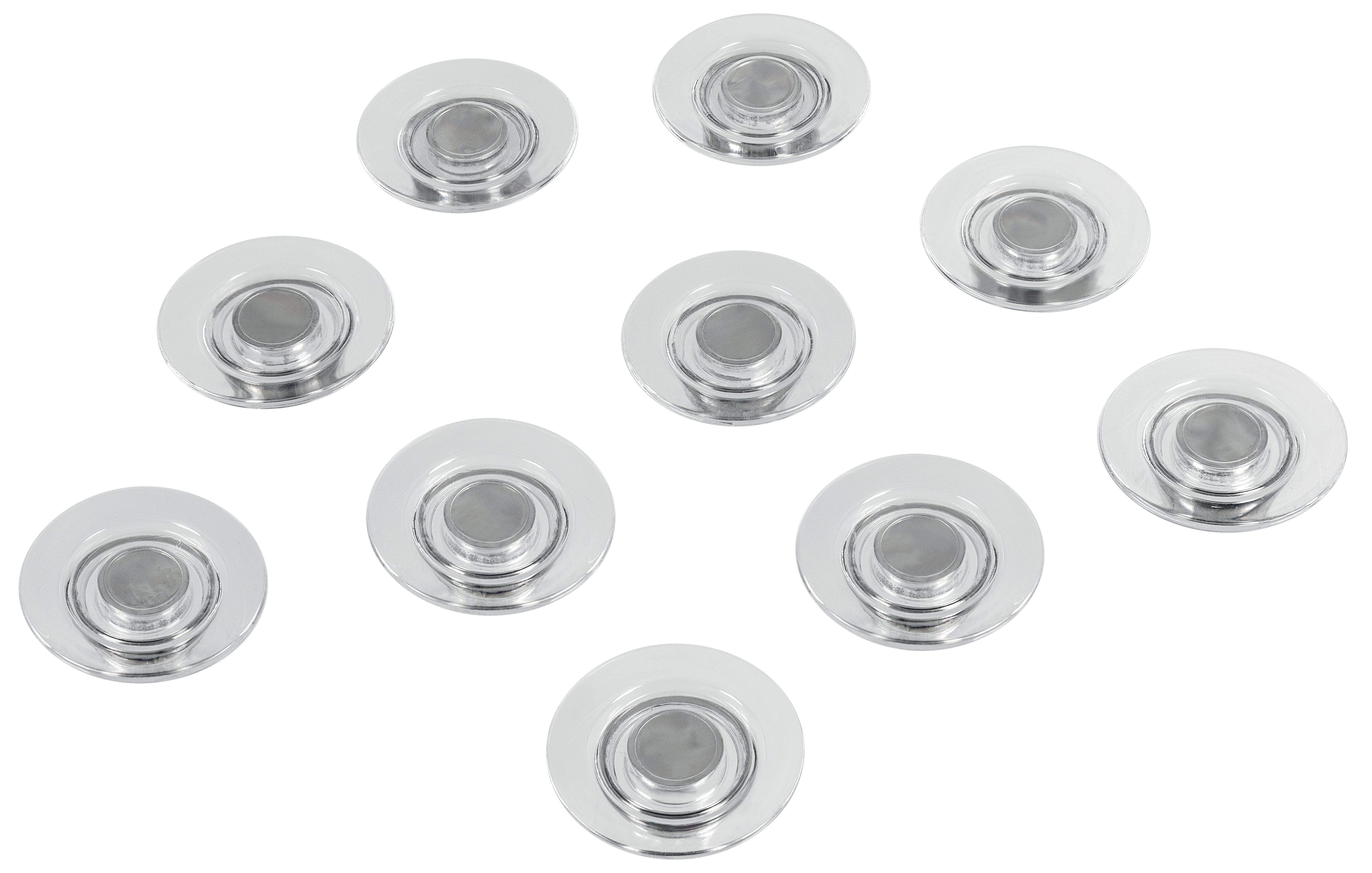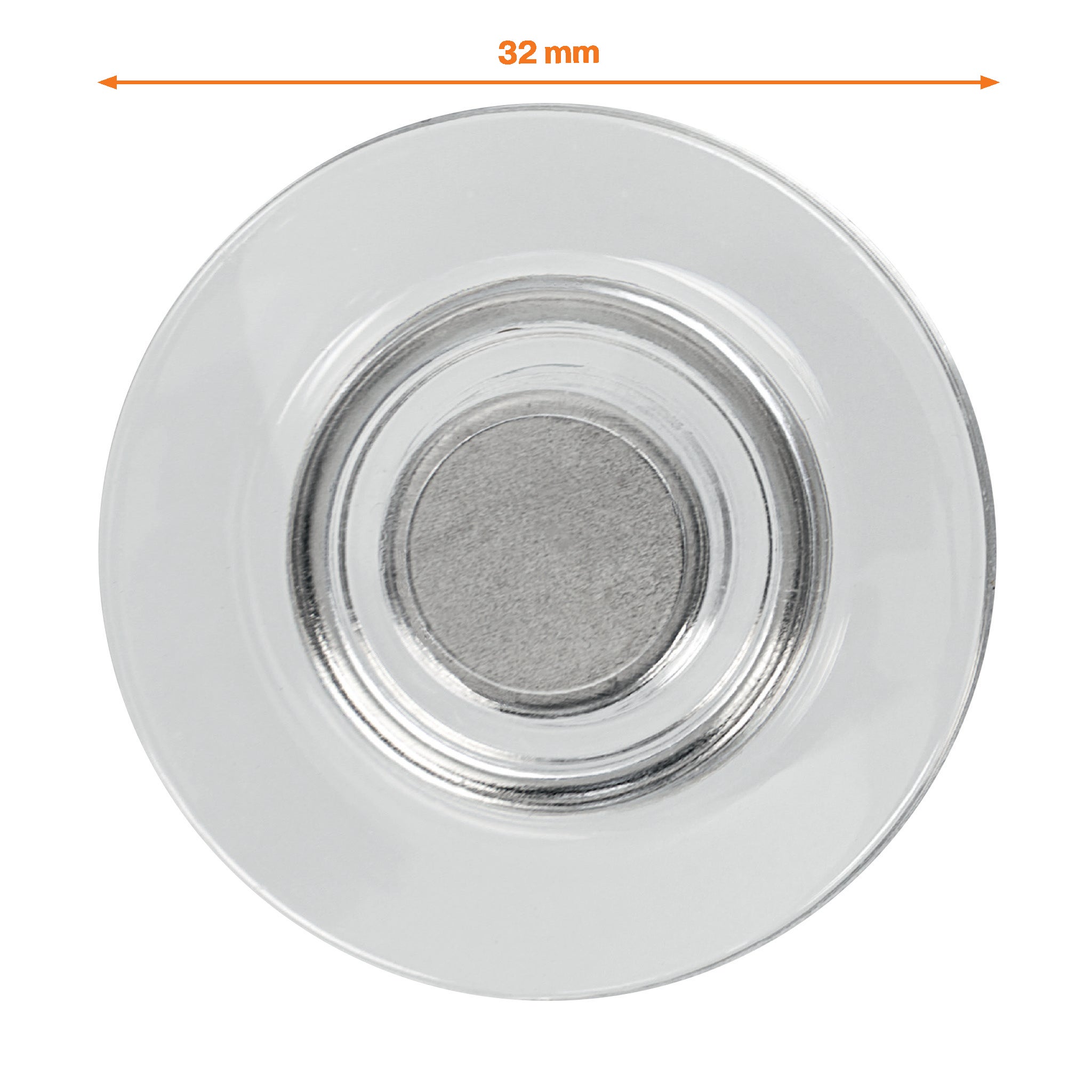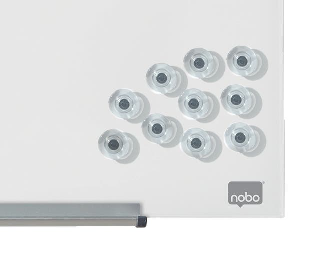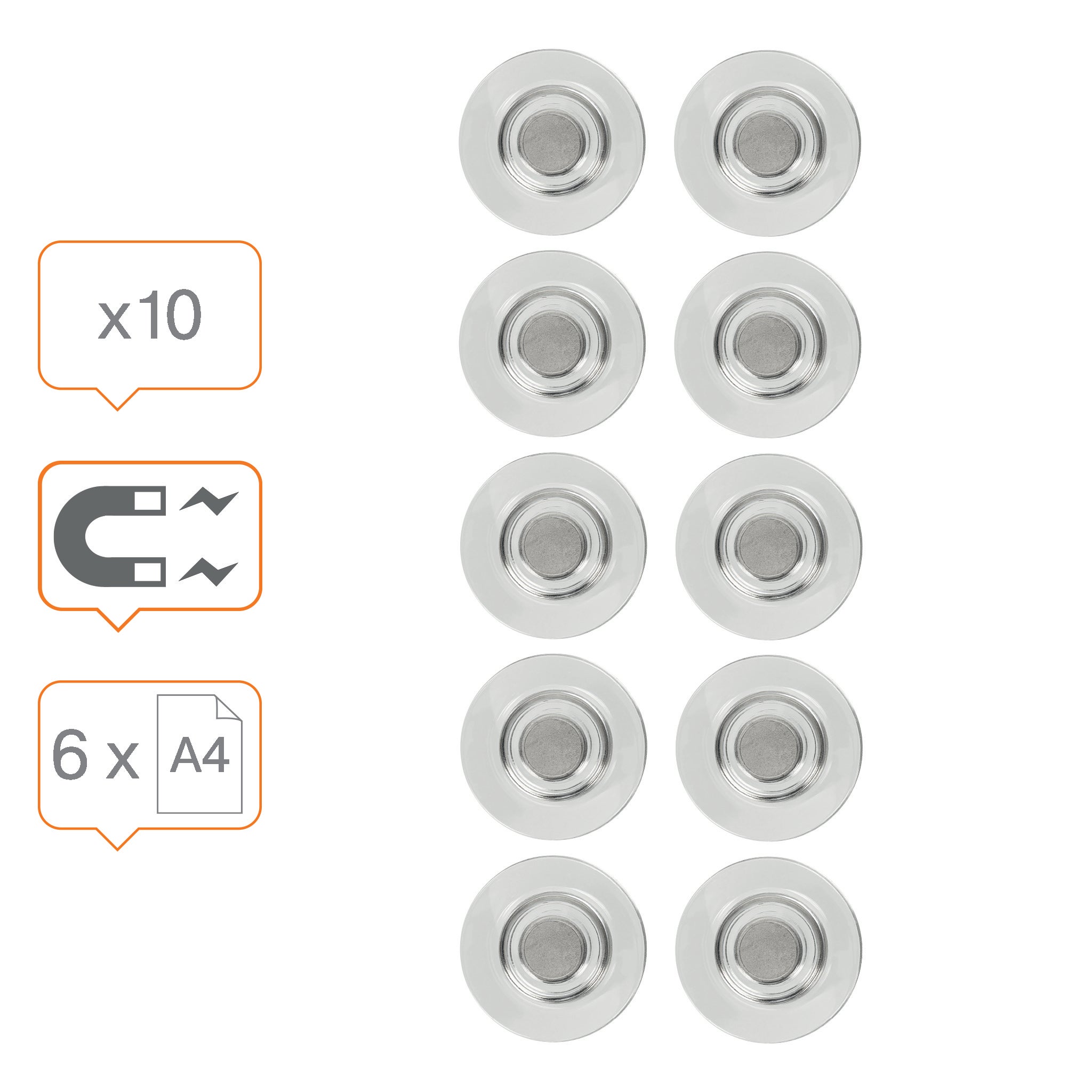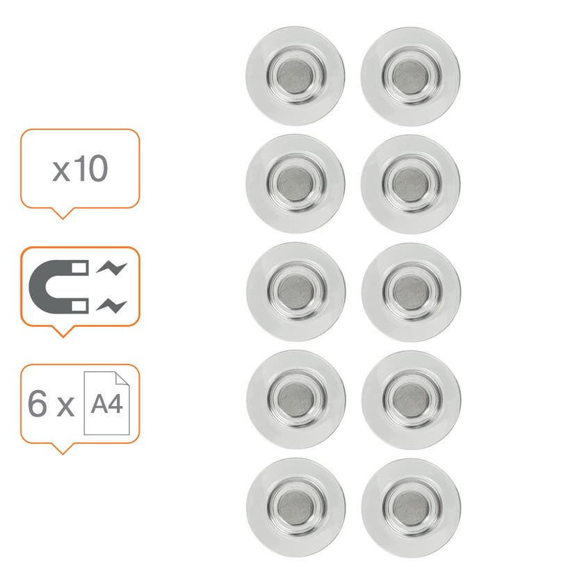 De här runda, transparenta och starka magneterna är speciellt utvecklade för användning på glasytor och kan hålla upp till 6 x 80 gsm A4-ark.