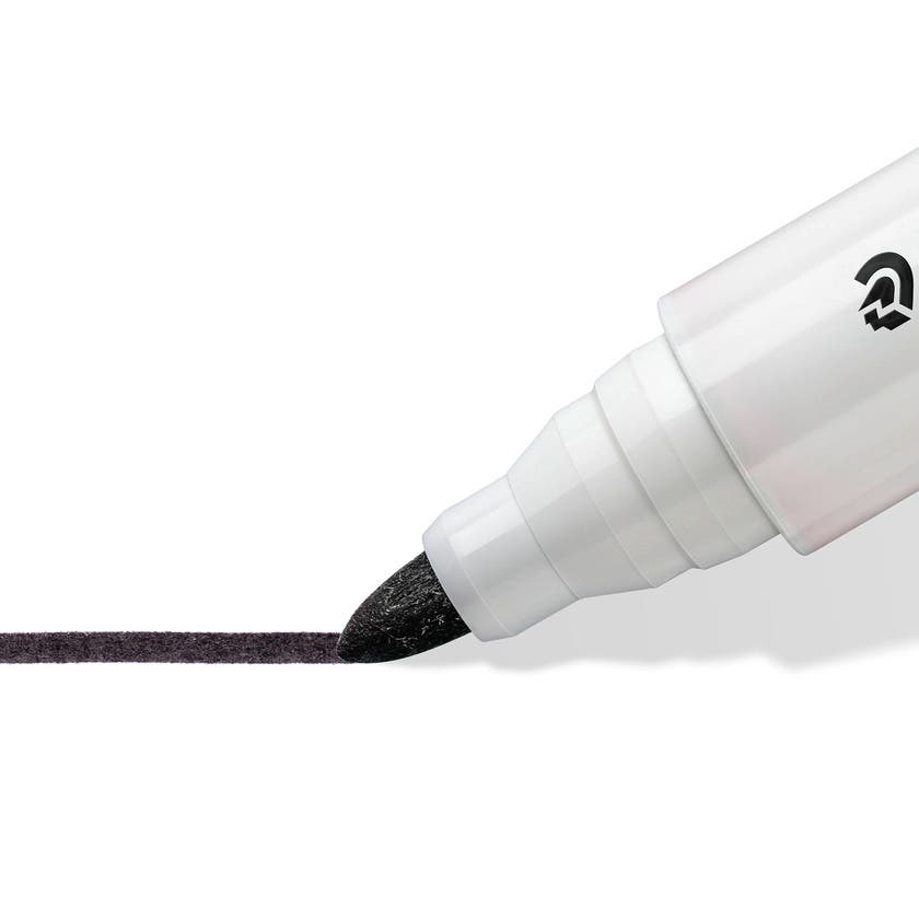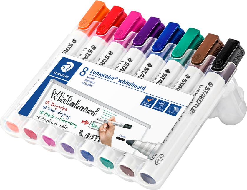 Staedtler Lumocolor® Whiteboardpennor med rund spets. Smart STAEDTLER-box i plast med 8 pennor. Whiteboarden kan torkas av med en torr trasa utan att lämna spår, och det gäller även för ytor av glas och porslin. Snabbtorkande, svag lukt. Låst spets. Kan ligga utan kork i flera dagar utan att torka.