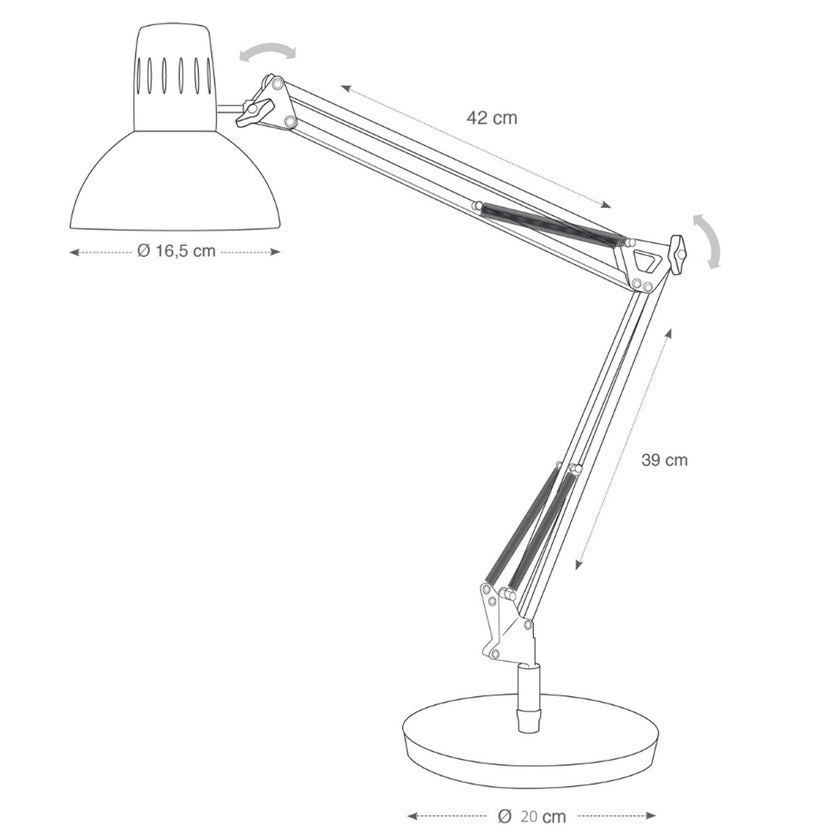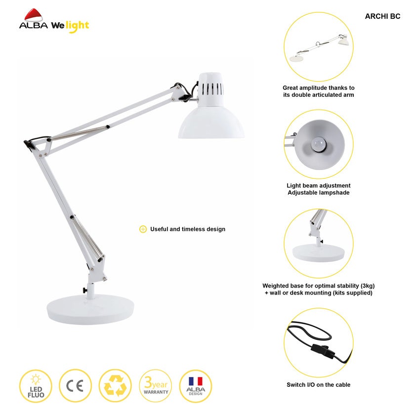 Den klassiska modellen levereras med strömbrytare på sladden, bordsfot diameter 20 cm samt bordsklämma med 55 mm grepp. Perfekt stabilitet tack vare den rundade foten med vikt - 3 möjliga placeringar är: Bord, Väggfästning, Klämma (kit medföljer).