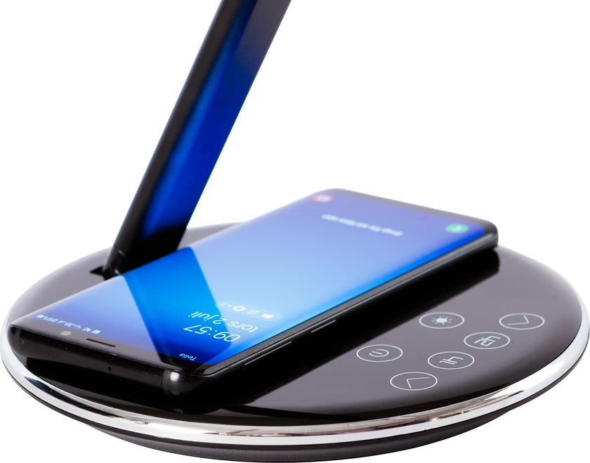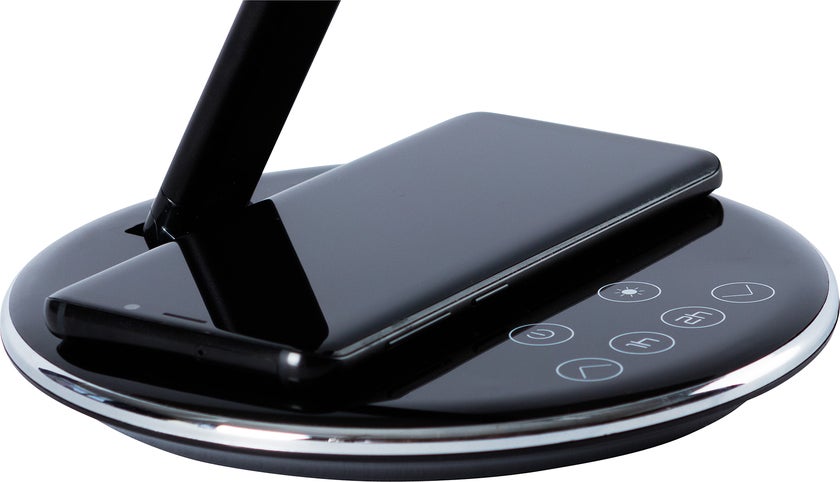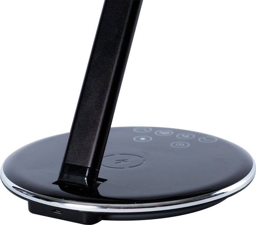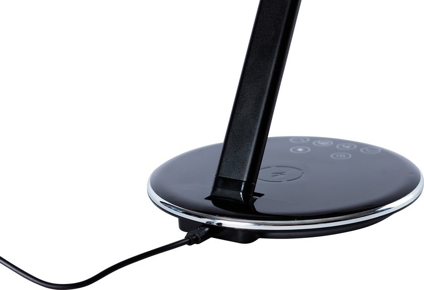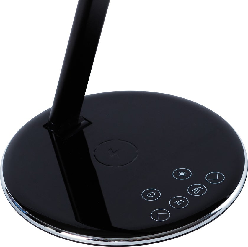 Smarta skrivbordslampa Qlite är en stilren bordsarmatur med inbyggd QI-laddare i basen som möjliggör enkel och smart laddning av telefoner som stödjer trådlös laddning. Perfekt för kontorsarbetsplatsen eller hemmakontoret. Armaturen är enkel att dimra tack vare de smarta touchknapparna med tydliga symboler. Likaså justerar man färgtemperaturen i fyra nivåer, från varmvitt till kallvitt ljus. Den låga strömförbrukningen om 5W ger en miljöanpassad armatur, dessutom finns det automatisk avstängningstimer i basen för både en och två timmars belysning.