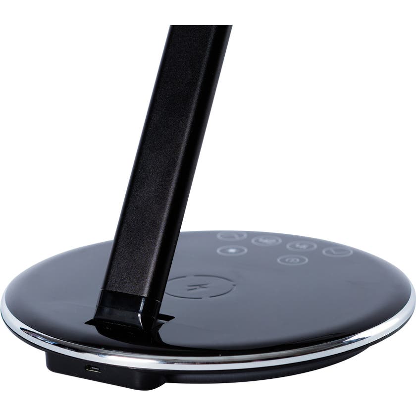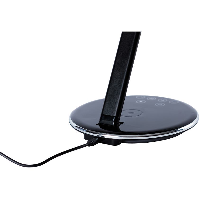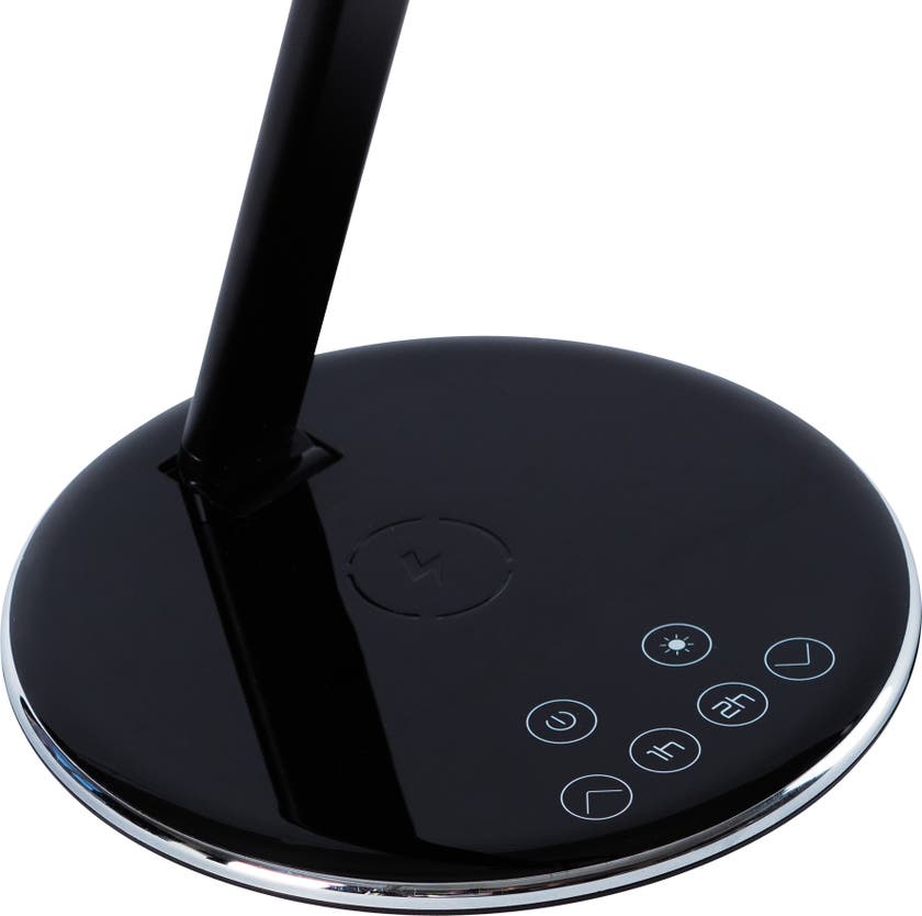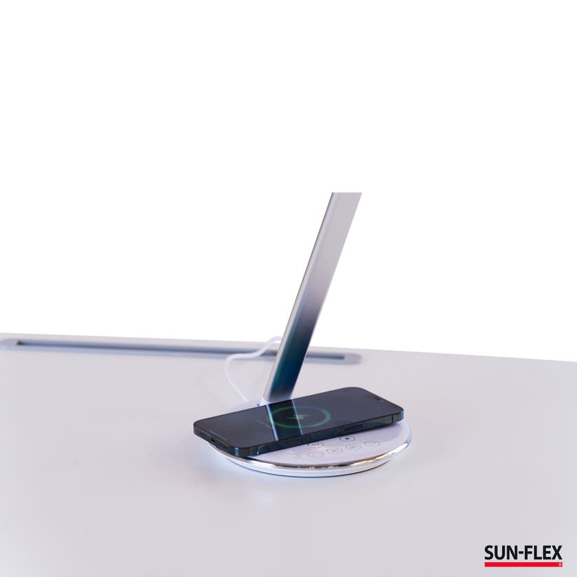 Smarta skrivbordslampan SUN-FLEX® Qlite, är en stilren bordsarmatur med inbyggd QI-laddare i basen som möjliggör enkel och smart laddning av telefoner som stödjer trådlös laddning. Perfekt för kontorsarbetsplatsen eller hemmakontoret. Armaturen är enkel att dimra tack vare de smarta touchknapparna med tydliga symboler. Likaså justerar man färgtemperaturen i fyra nivåer, från varmvitt till kallvitt ljus. Den låga strömförbrukningen om 5W ger en miljöanpassad armatur, dessutom finns det automatisk avstängningstimer i basen för både en och två timmars belysning.