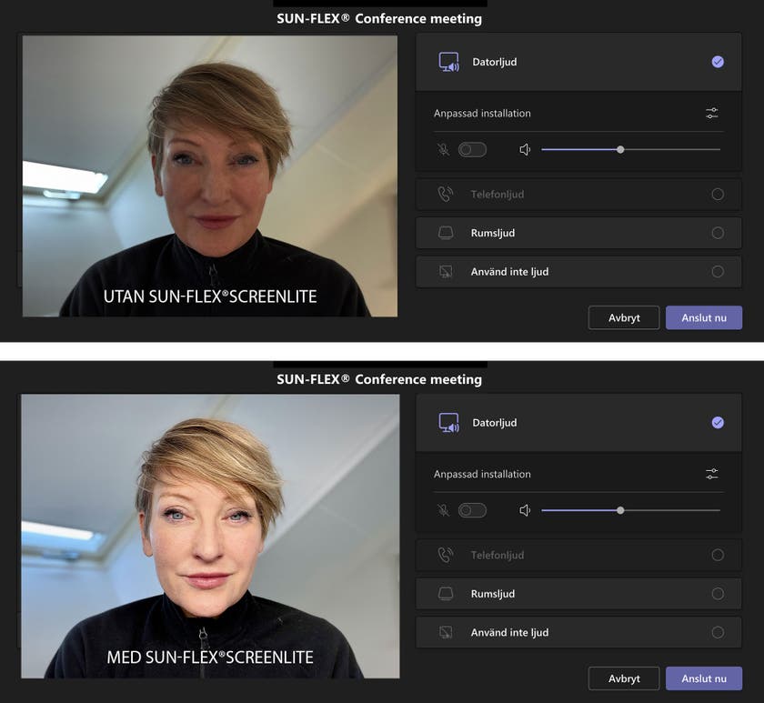 Digitala möten – Arbetar man via digitala möten använder man enkelt SUN-FLEX®SCREENLITE™ som ljusförstärkare genom att vinkla upp den långa ljuskällan. Detta ökar skärpan och kontrasten vilket ger bättre kvalitet på möten. Smart belysning.