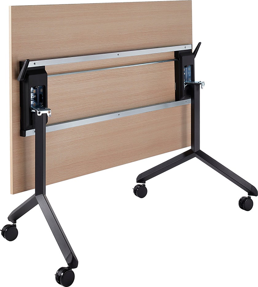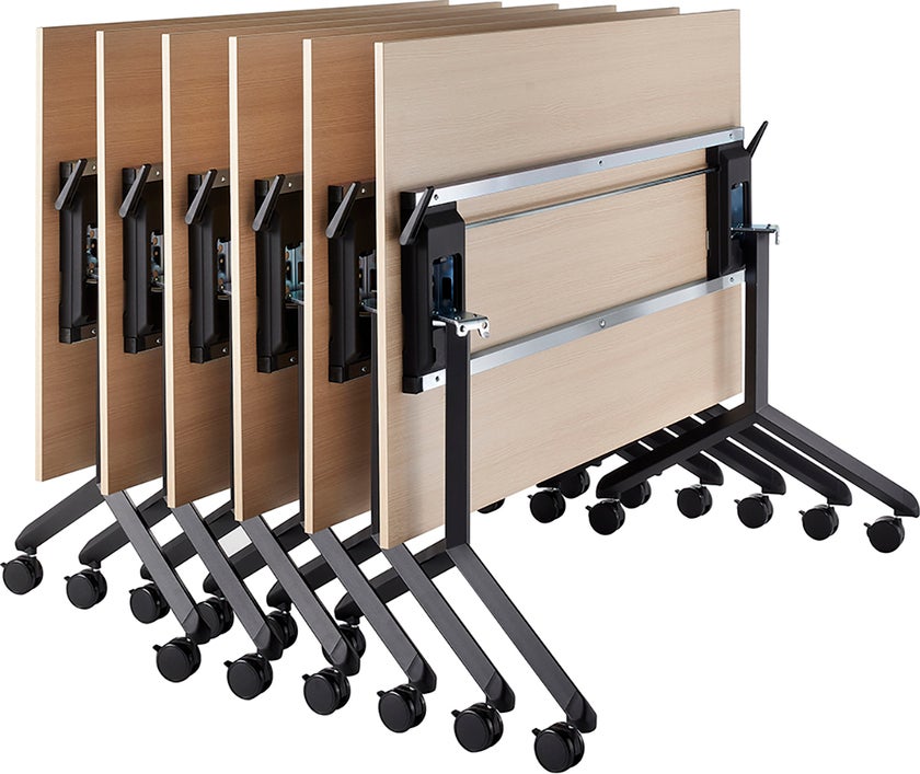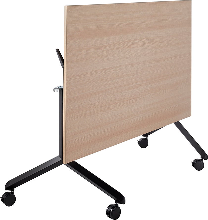 Stativ med hjul till fällbart konferensbord där skivan enkelt kan fällas ner när bordet inte används. Ergofunk Tilt-stativet erbjuder minimal och enkel förvaring då den är stapelbar horisontellt och på grund av dess sluttande stängande fot. Ergofunk Tilt kommer på låsabara hjul för att enkelt kunna ställa undan och ta fram efter behov.