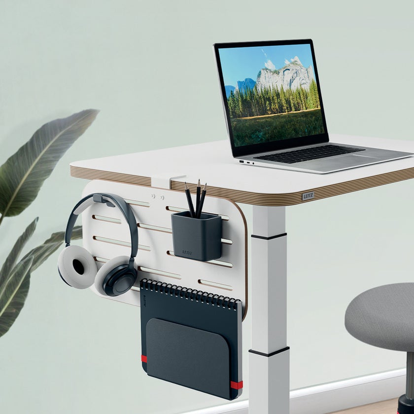 Håll ditt skrivbord snyggt och få ut det mesta av utrymmet med förvaringstavlan Pegboard Ergo från Leitz. Den unika, vertikala skrivbordstavlan är enkel att montera på eller under ett skrivbord eller bord och skapar omedelbar förvaring för allt från headset till anteckningsblock och pennor. Håll alla dina saker organiserade och lätta att hitta, samtidigt som du frigör värdefullt skrivbordsutrymme.
