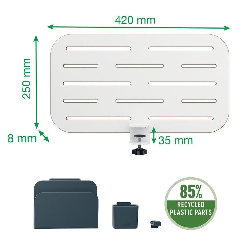 Förvaringstavlan är gjord av slitstark MDF för att säkerställa styrka och stabilitet. Mjuka gummikuddar skyddar skrivbordsytan från repor. Förvaringstillbehör i 85% återvunnen plast medföljer (1 x anteckningsblockshållare, 1 x pennhållare och 1 x hängkrok för ett headset). De placeras enkelt på förvaringstavlan för att skapa en anpassad personlig arbetsyta.