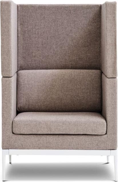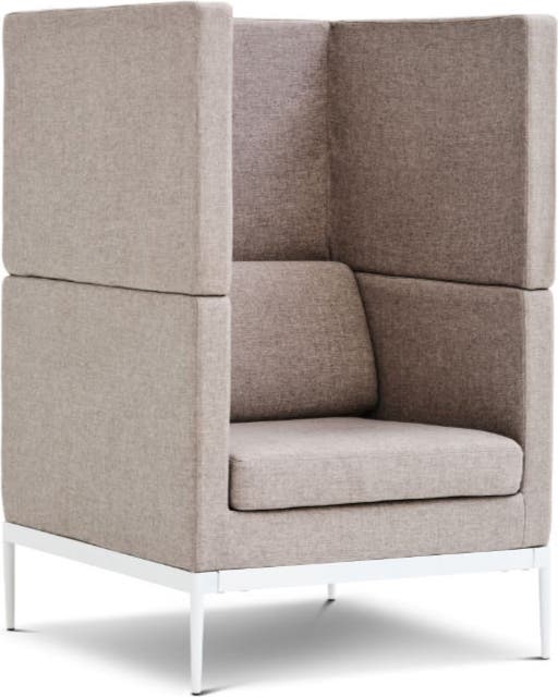 Bergamo fåtölj med hög rygg skapar en ljudabsorbent och en skyddad samtalsmiljö. Använd den som telefonfåtölj. Generöst sittdjup och härlig ryggvinkel. Finns i grått tyg och vitt underrede.