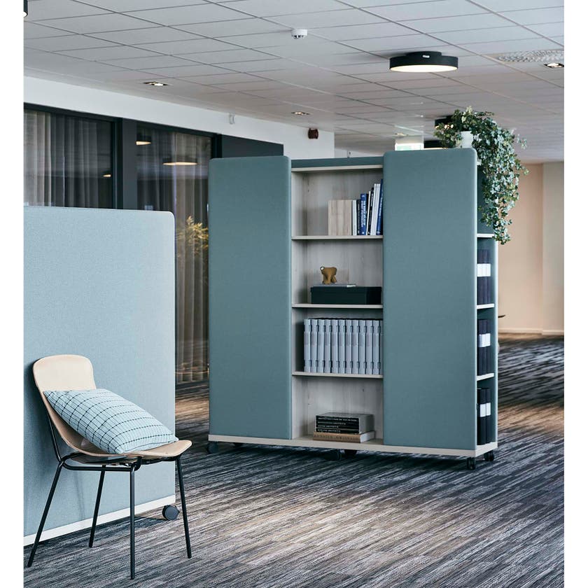 Moving Wall Tower är en ljudabsorberande rumsavdelare med förvaring och diskret kabelsanering. 40 mm tjock ljudabsorbent på båda sidor. Förvaring på båda kortsidor med hyllplan i asklaminat, och fprvaring på ena långsidan. I toppskivan sitter 2st integrerade kabelgenomföringar.