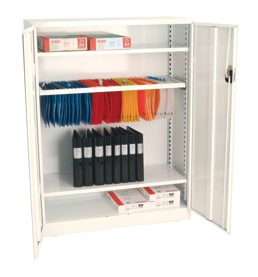 Förvaringsskåp 1320 levereras med tre hyllplan, varav två är flyttbara. Rymmer ca 45 st A4-pärmar.