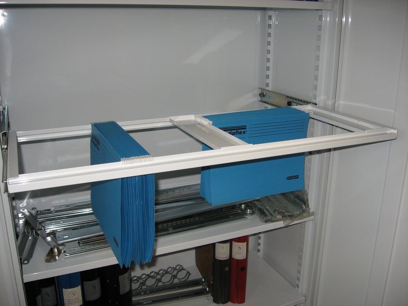 Utdragbar hängmappsram/mappskena som passar till 1320/1970 förvaringsskåp/arkivskåp. Förenklar förvaringen av dokumenten i hängmapparna i arkivskåpen.
