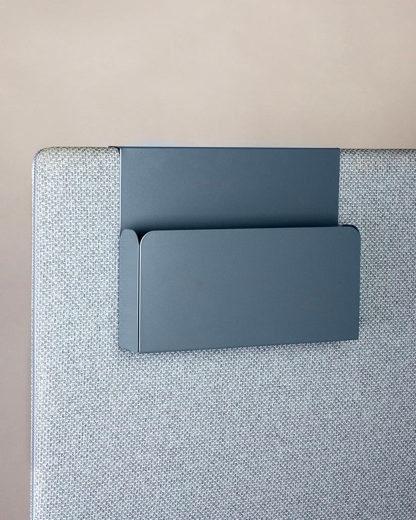 Stilrent A4-fack i lackad metall att hänga över A30-skärmar.