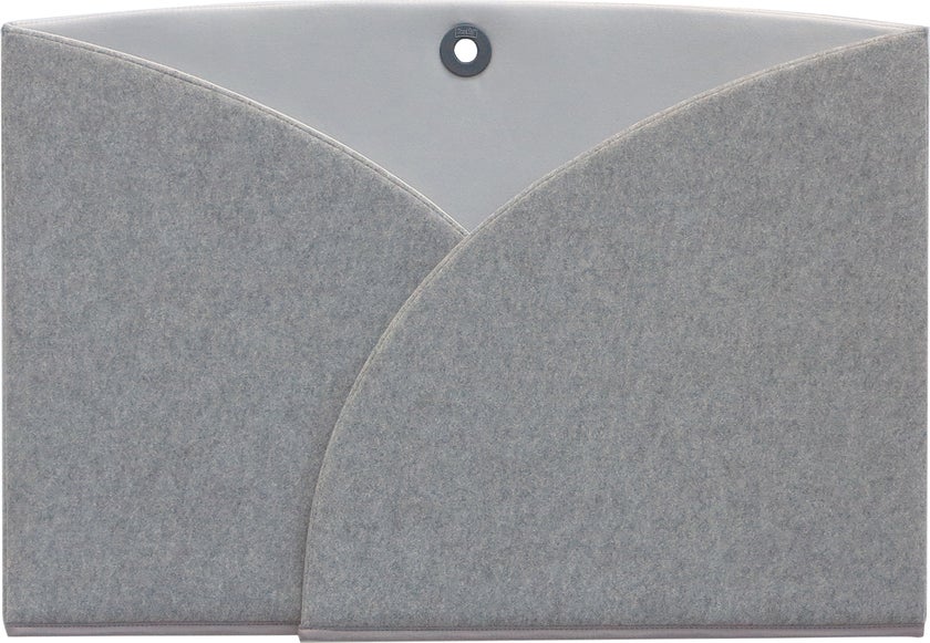 Den är utvändigt klädd med ett grått, lätt melerat tyg med tuftad look. Invändigt är den klädd med alcantara-liknande tyg. Öljetten gör att du kan hänga upp skärmen då den inte används. En silikonsträng i nederkanten på skärmen ger extra effektivt glidskydd. Skärmen består av tre delar som man lätt vinklar till önskat behov.