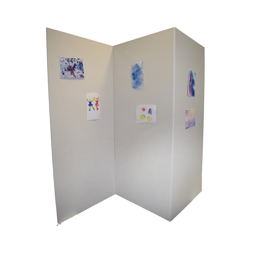 3-delad utställningsskärm/vikvägg tillverkad av klorfri wellkartong. Viks lätt ihop efter användning, enkelt att ställa undan till nästa användnings tillfälle.