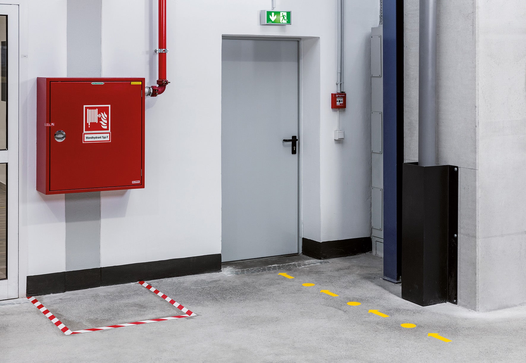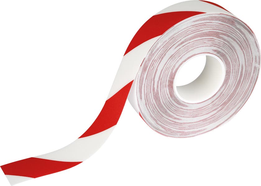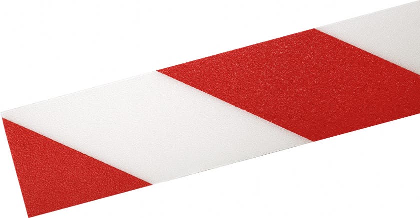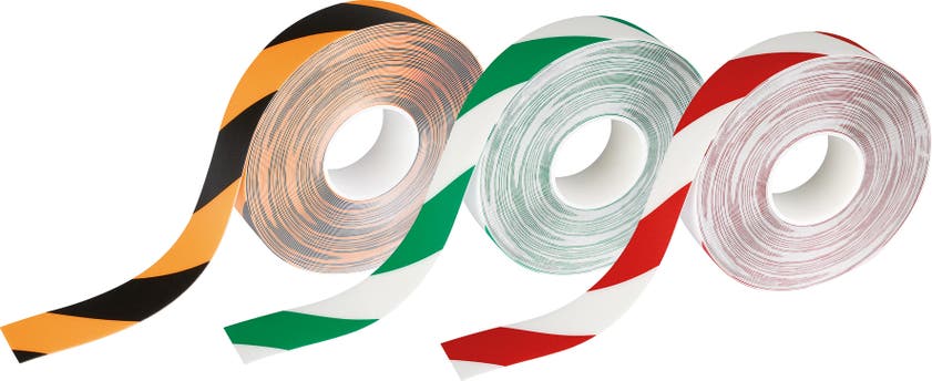 Självhäftande randig markeringstejp för inomhusbruk. Används för permanent markering av riskområden som behöver uppmärksammas t ex trafikzoner och spärrområden.