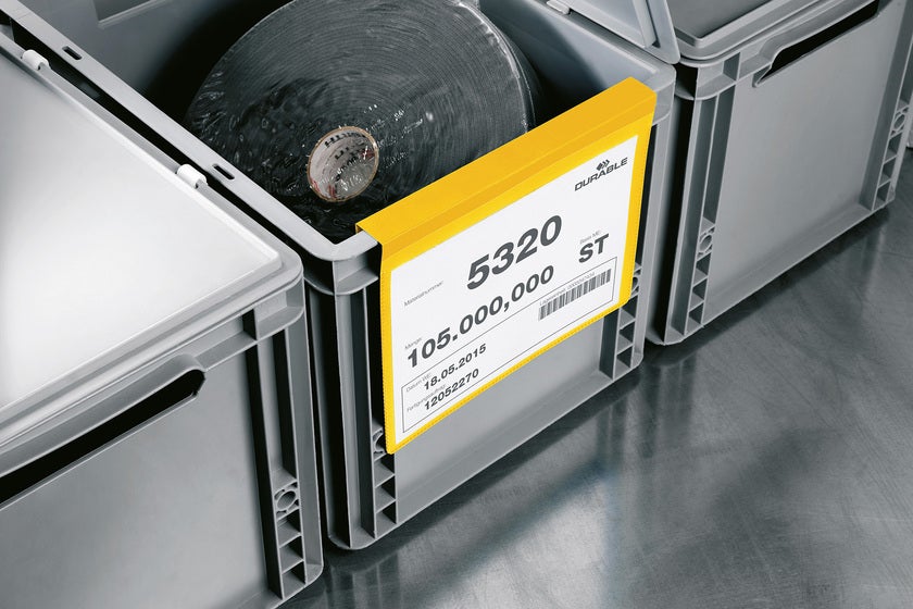 Dessa plastfickor av slitstark polypropylene går att läsa med skanner och skyddar de utbytbara inlagorna från smuts och slitage. Fickorna levereras platta och är förberedda att vikas för två olika funktioner. Vik en gång och det blir en ficka som är vinklad 90° och kan stickas in mellan staplade kartonger. Inget behöver klistras fast på kartongen och fickan hålls på plats av tyngden från kartongen ovanför. Vik två gånger och det blir som en bockad ficka att hänga över t ex pallkragekanter som är max 22 mm. Gratis mall för etiketten finns på www.duraprint.se.
