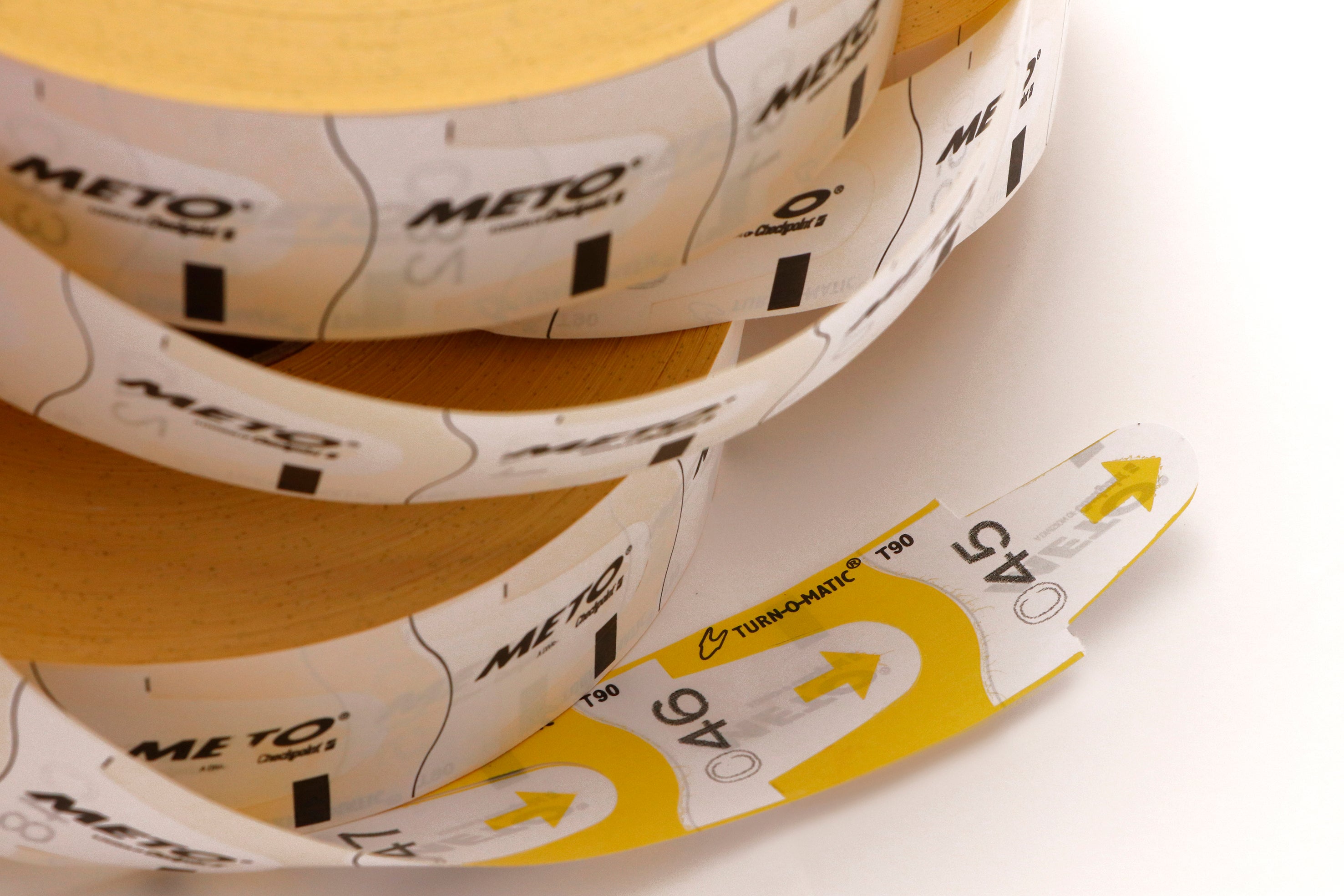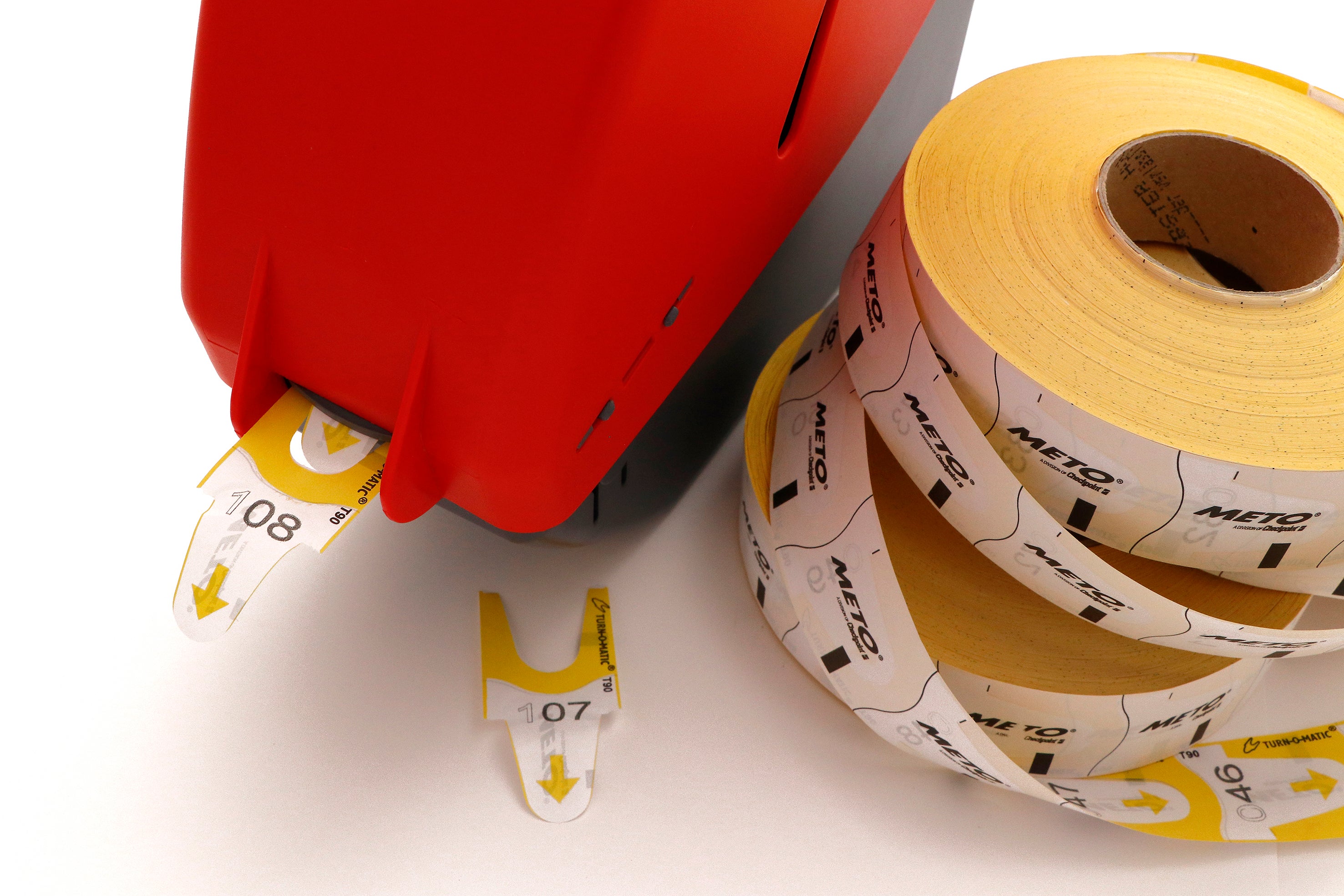 Nummerlappar Meto T90 på rulle till Metos nummerautomater. Svart utskrift på kölapparna i färg (T). D900A3-sensor märkning på baksidan.