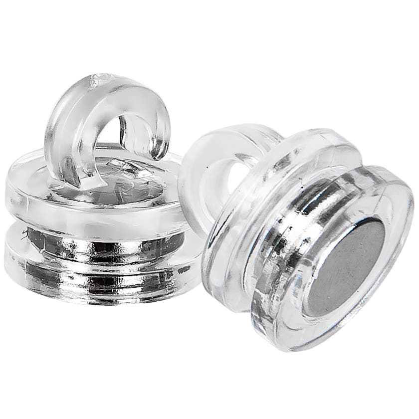 Transparent takmagnet, perfekt för upphängning av produkter. Magneten har en diameter på 15 mm och en öppning på 5 mm. Den klarar en vikt på upp till 3 kg.
