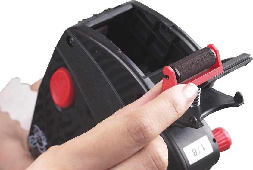 * Öppna frontluckan och ta försiktigt ut den använda bläckrullen, sätt in den nya bläckrullen och stäng luckan. Prispistolen är nu klar att använda.