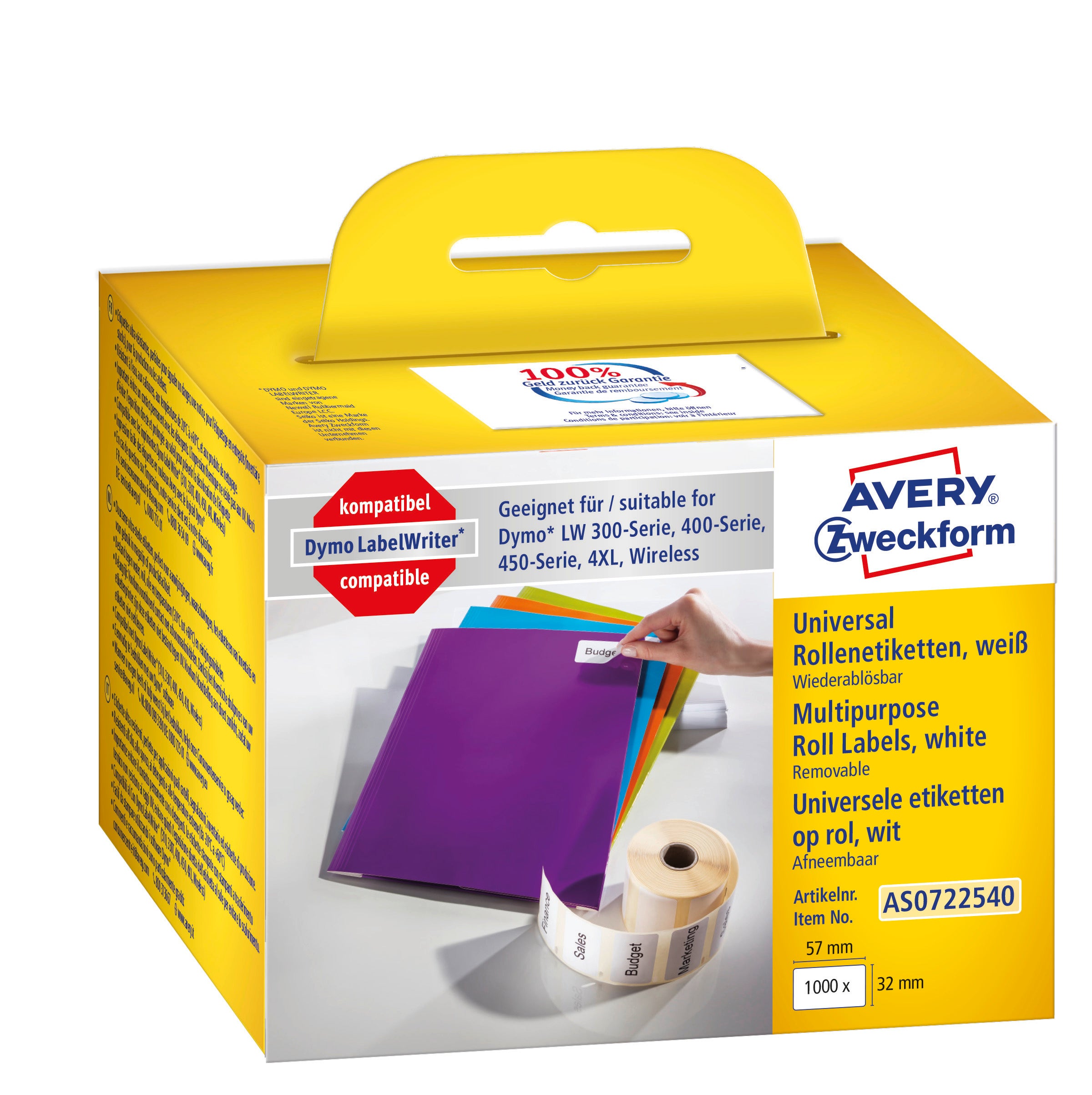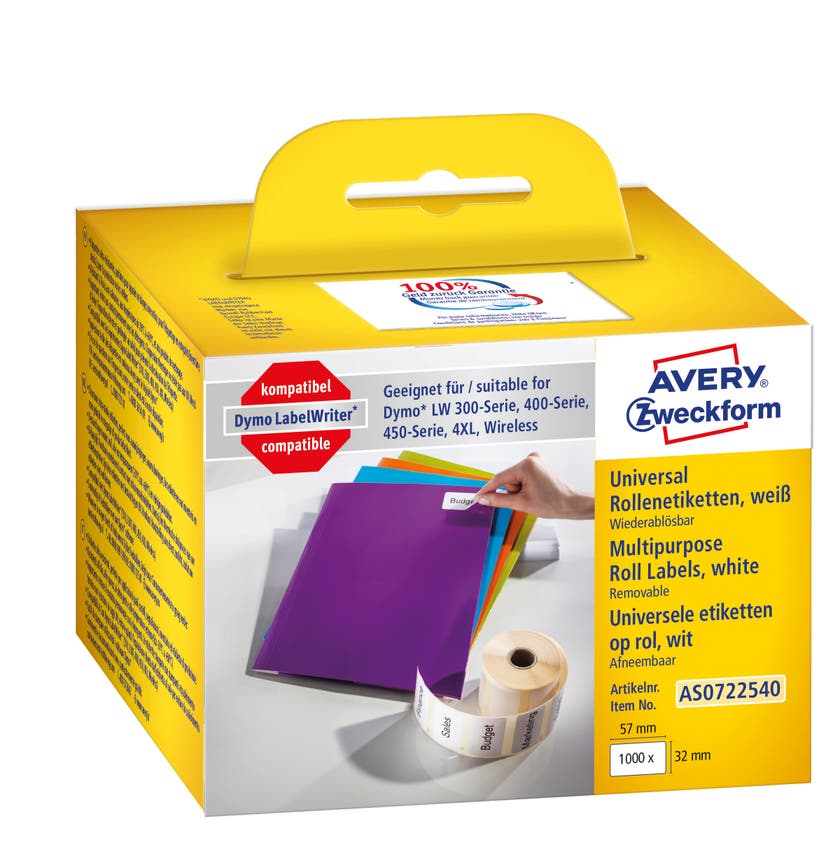 Saknar du etiketter till din DYMO® LabelWriter™? Averys AS0722540 avtagbara etiketter på rulle för etikettskrivare motsvarar DYMO® S0722540 och är 100% kompatibel med DYMO® LabelWriter™ LW310, LW330T, LW400 Serie, LW450 Serie, 4XL, och LW Wireless!