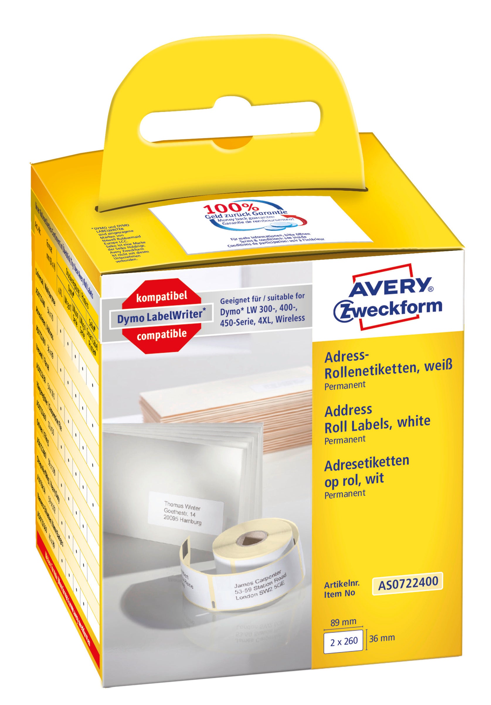 Behöver du etiketter till din Dymo® LabelWriter™? Averys AS0722400 adressetiketter på rulle för etikettskrivare motsvarar DYMO® S0722400 samt är 100% kompatibel med DYMO® LabelWriter™ LW310, LW330T, LW400 Serie, LW450 Series, 4XL, LW Wireless! Med denna förpackning får du Averys kända kvalitetsetiketter till ett mycket attraktivt pris.