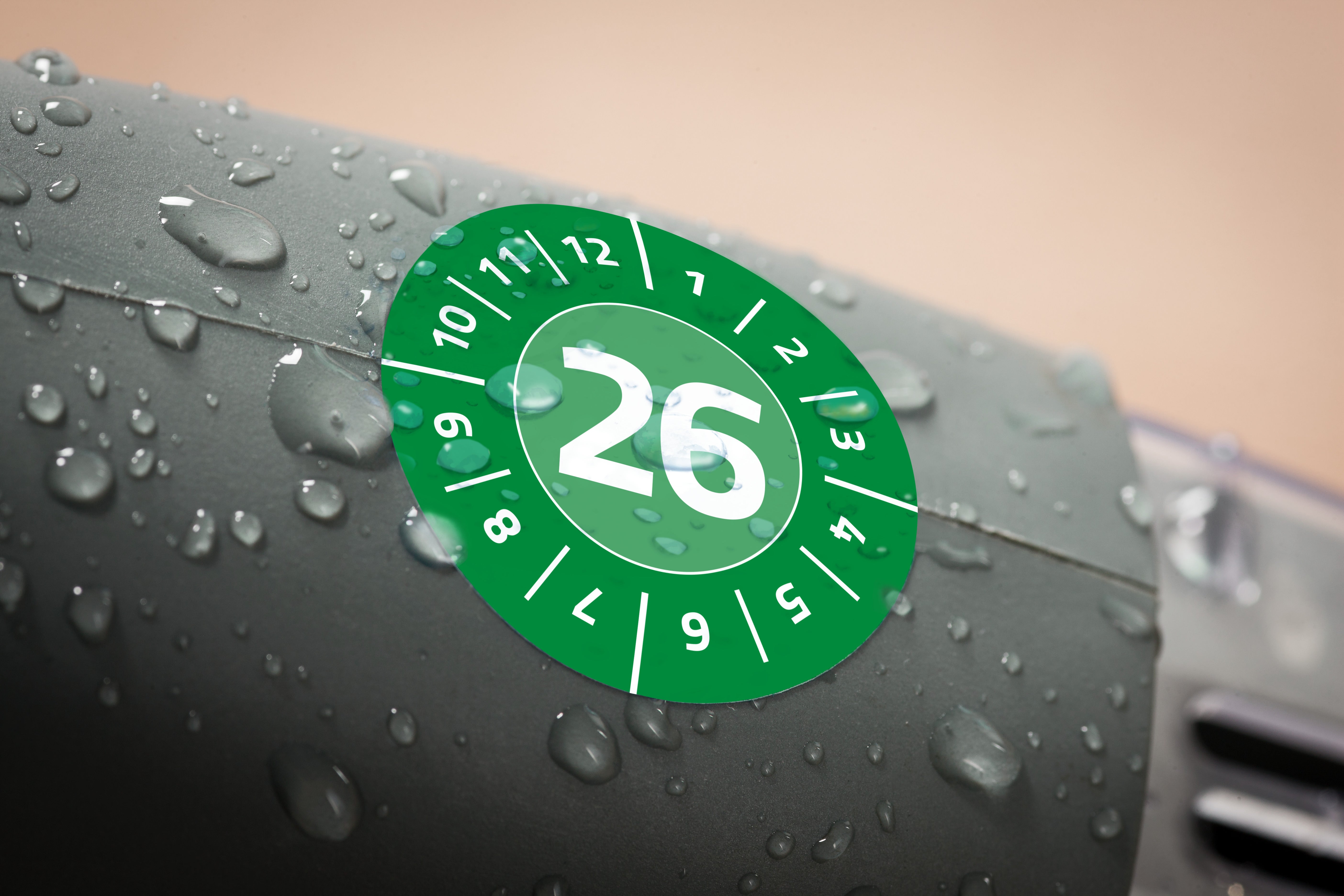 Inspektionsetiketterna är tillverkade i ett vinlymaterial och är extremt tåliga mot yttre påverkan. De är motståndskraftiga mot vatten och olja samt rengörings-, desinfektions- och lösningsmedel. Varje förpackning innehåller 120 etiketter som var och en har måttet Ø 20 mm. Arken är förpackade i en smart och behändig bok som kan förvaras i fickorna på arbetskläderna eller i verktygslådan.