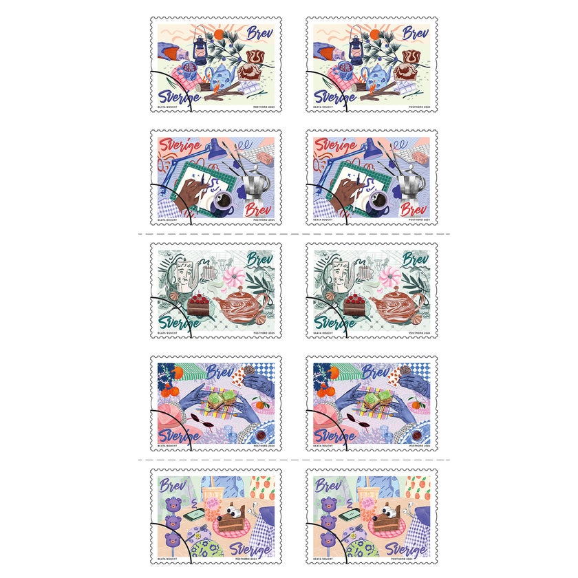 Inrikes frimärken med temat Fika. Självhäftande och kommer på ark med 10 frimärken i 5 olika motiv.