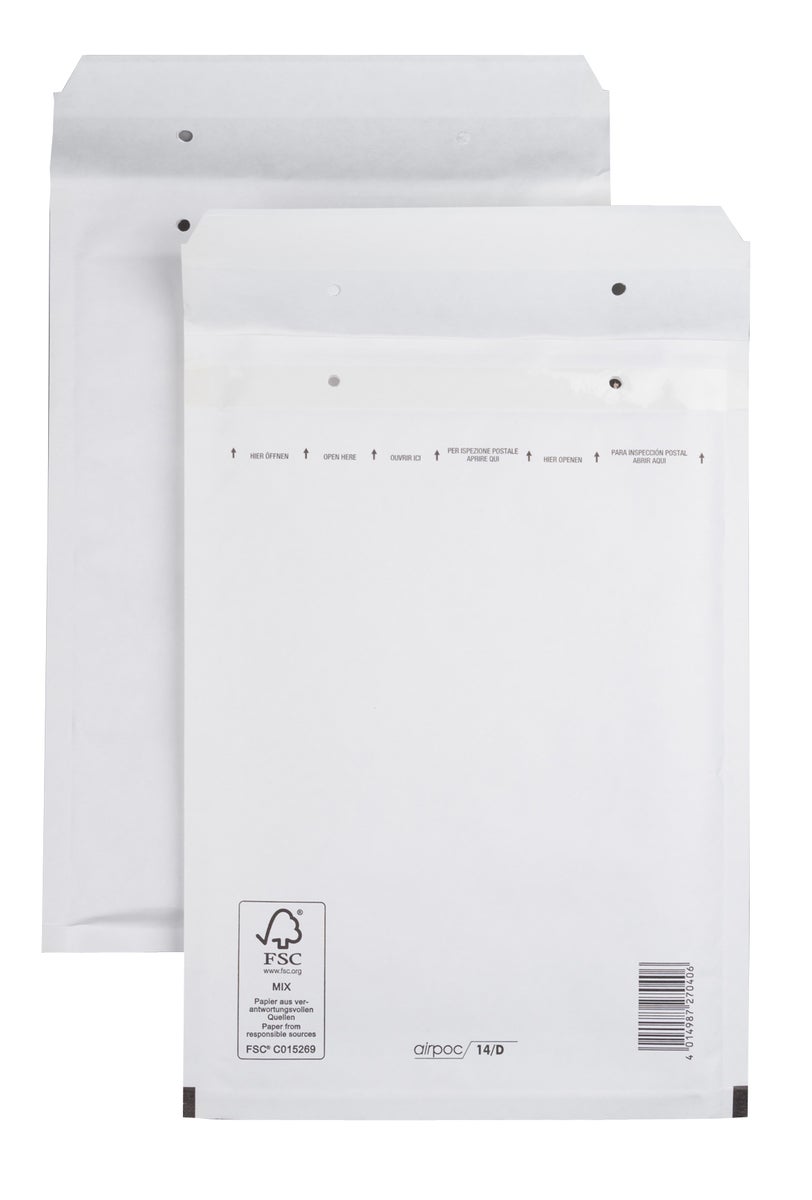 Skyddande är dessa vadderade bubbelpåsar airpoc. Sänd dina produkter tryggt och säkert i de vadderade kuverten / påsarna. Varupåsar av 80 gram kraftpapper och foder av bubbelplast. Påsen är laminerad av polyetenplast (PE). Återvinningsbar då folien kan lätt avskiljas från påsen för miljövänlig sortering. Självhäftande klaff med täckremsa. Passar bl.a. för dig som håller på med: Media, Marknadsföring, Reklam, internet försäljning och hantverkstillverkare. * Klaffen är försedd med täckremsa * Vit * Låg vikt * 10-pack * Miljömärkt: FSC Mix