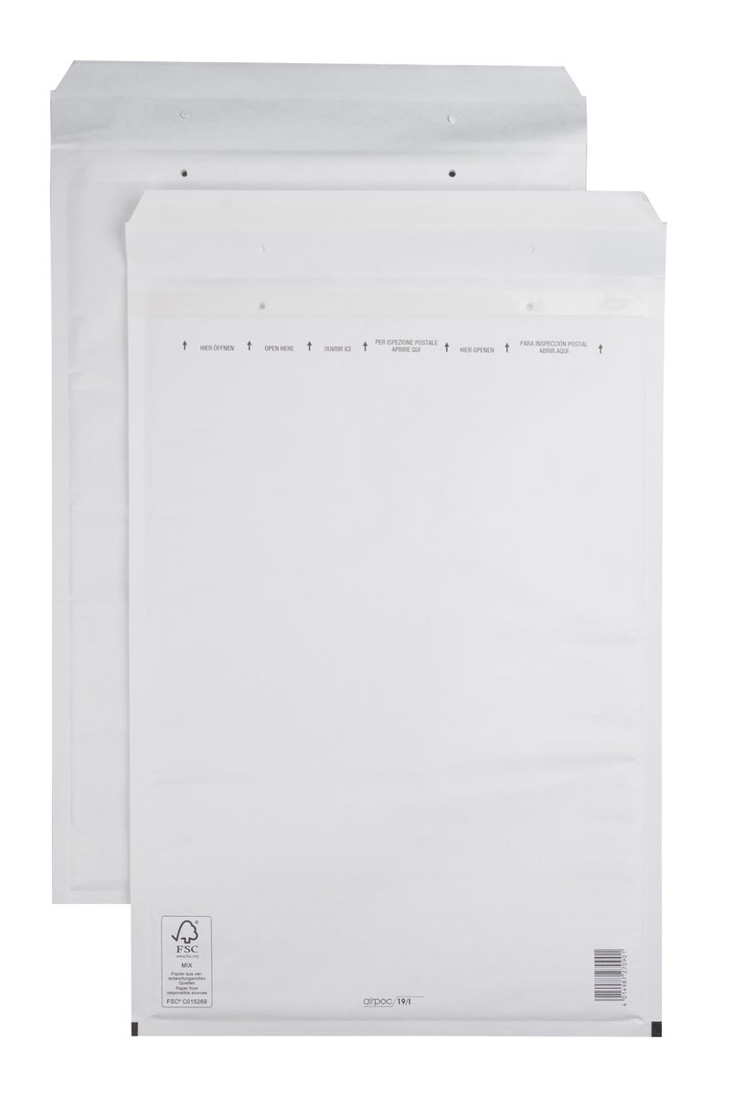 Skyddande är dessa vadderade bubbelpåsar airpoc. Sänd dina produkter tryggt och säkert i de vadderade kuverten / påsarna. Varupåsar av 80 gram kraftpapper och foder av bubbelplast. Påsen är laminerad av polyetenplast (PE). Återvinningsbar då folien kan lätt avskiljas från påsen för miljövänlig sortering. Självhäftande klaff med täckremsa. Passar bl.a. för dig som håller på med: Media, Marknadsföring, Reklam, internet försäljning och hantverkstillverkare. * Klaffen är försedd med täckremsa * Vit * Låg vikt * 10-pack * Miljömärkt: FSC Mix