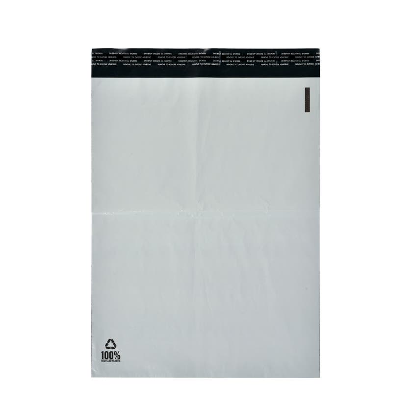 E-handelspåsar – postorderpåsar med handtag i vit plast för emballering av exempelvis kläder, textilier m.m. Tillverkade av 100% återvunnen plast.