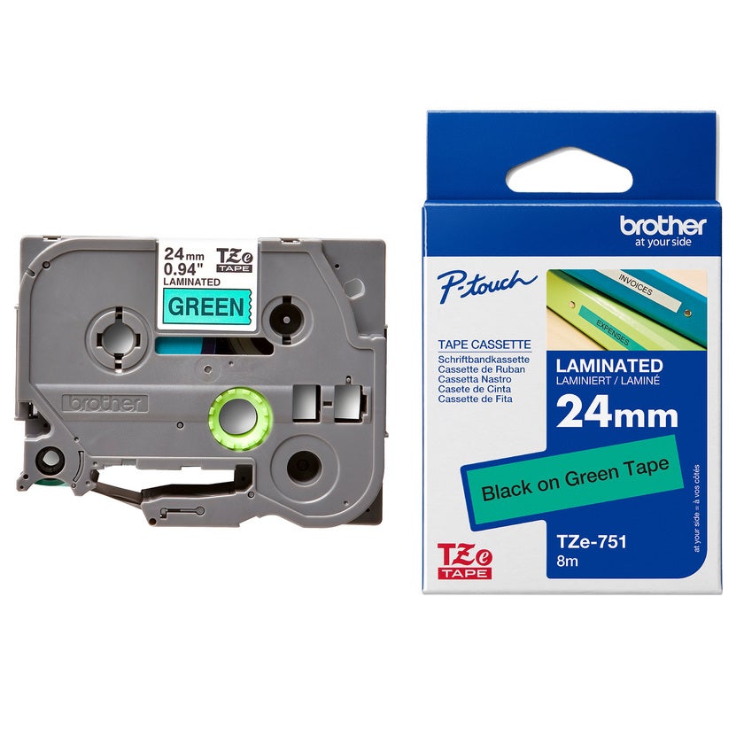 Brother TZe751 original tape – svart på grön – märkband av hög kvalitet. TZe751 original tape fungerar perfekt med Brother P-touch märkmaskiner. Den laminerade, svart på grön, tapen är lätt att läsa och passar för märkning i hemmet, på kontoret eller andra arbetsplatser.