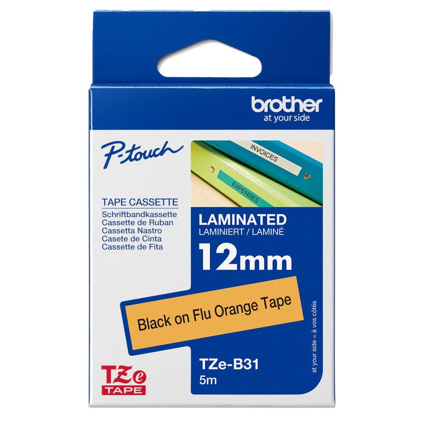 Brother TZe-B31 original tape – svart på neon-orange laminerad – märkband av hög kvalitet. Svart på orange neon laminerad tape är perfekt för att skapa etiketter som drar till sig uppmärksamhet. Lämplig när du vill visa viktig information, skapa varningsskyltar eller organisera specialutrustning. Med TZe-B31 kan exempelvis viktiga artiklar snabbt identifieras i en nödsituation. Etikettapen fungerar med P-touch märkmaskiner som har TZ- eller TZe-logotypen på kassettkåpan.