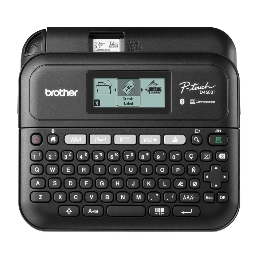 Märkmaskin Brother PT-D460BTVP. En kompakt, lättanvänd märkmaskin med stor grafisk display för förhandsgranskning av etiketter före utskrift. Skriver ut tydliga laminerade etiketter. Du kan skapa en bekväm arbetsmiljö för alla, från att organisera viktiga filer och mappar, resurshantering och allmänna skyltar. Skapa etiketter med hjälp av det inbyggda tangentbordet, para ihop med en smart enhet med Bluetooth eller anslut till en dator via USB för ytterligare märkningsfunktioner med hjälp av Brothers iPrint&Label-app eller P-touch Editor-programvara.
