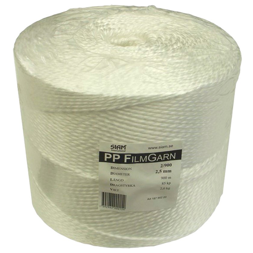 Dubbeltvinnat filmgarn/bindgarn av hög kvalité för industrianvändning och paketering, när man behöver bunta ihop olika produkter. Enkelt och smidigt att använda. Producerat av pp-plast.