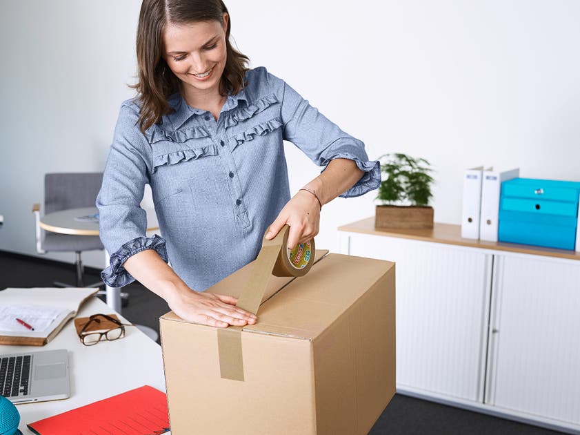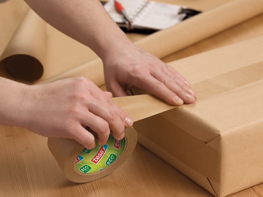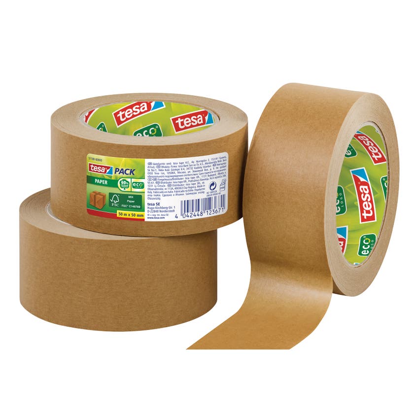 Tesas packtejp Paper ecoLogo® i papper. Robust, stark och miljöneutral av 60 % biobaserade material för förslutning av kartonger, lådor och kuvert. Starkt bärarmatererial tillverkad av oblekt papper.