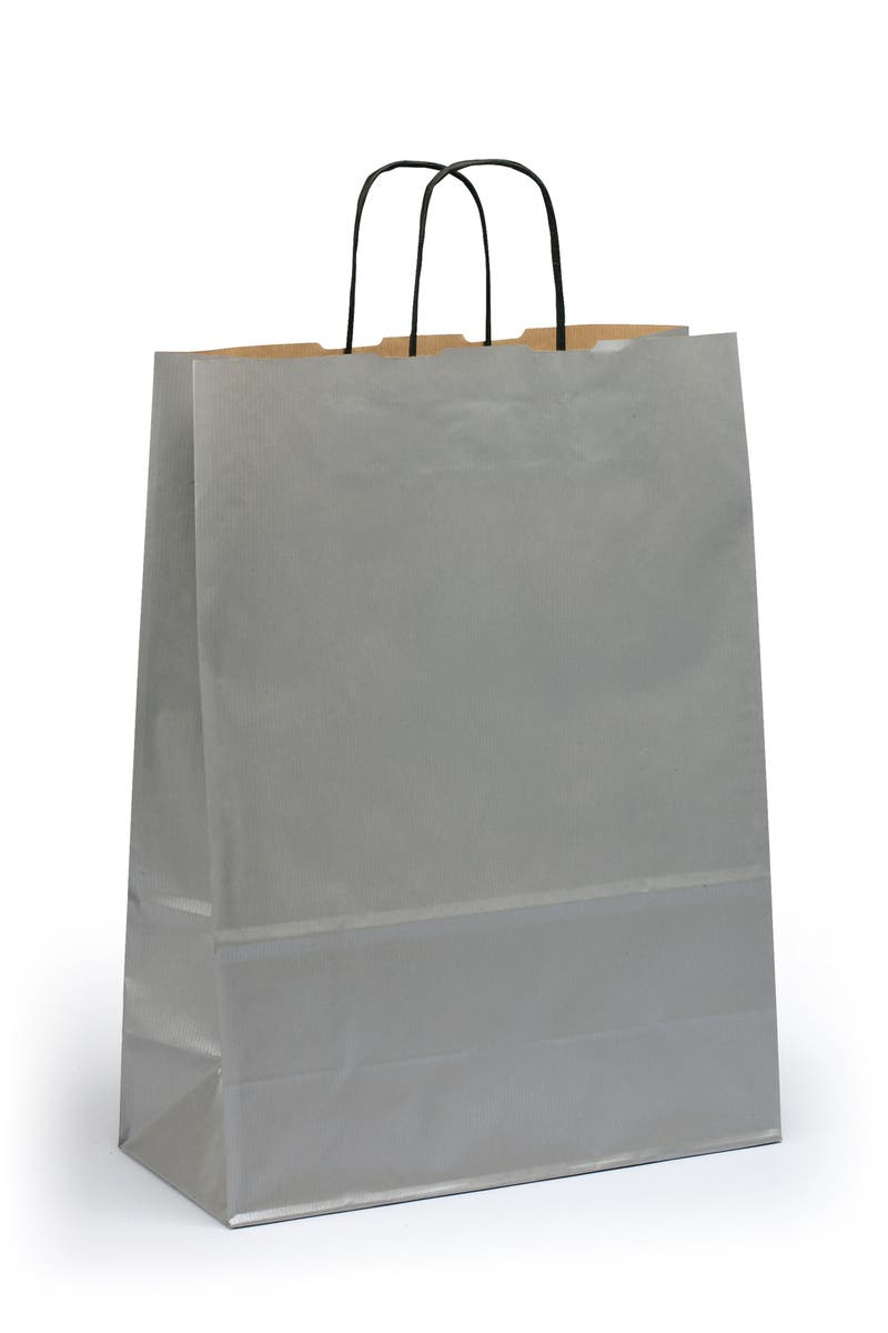 Sober papperskasse M med handtag av tvinnat papper. Bärkassarna har en extra förstärkt botten och är högkvalitativa.