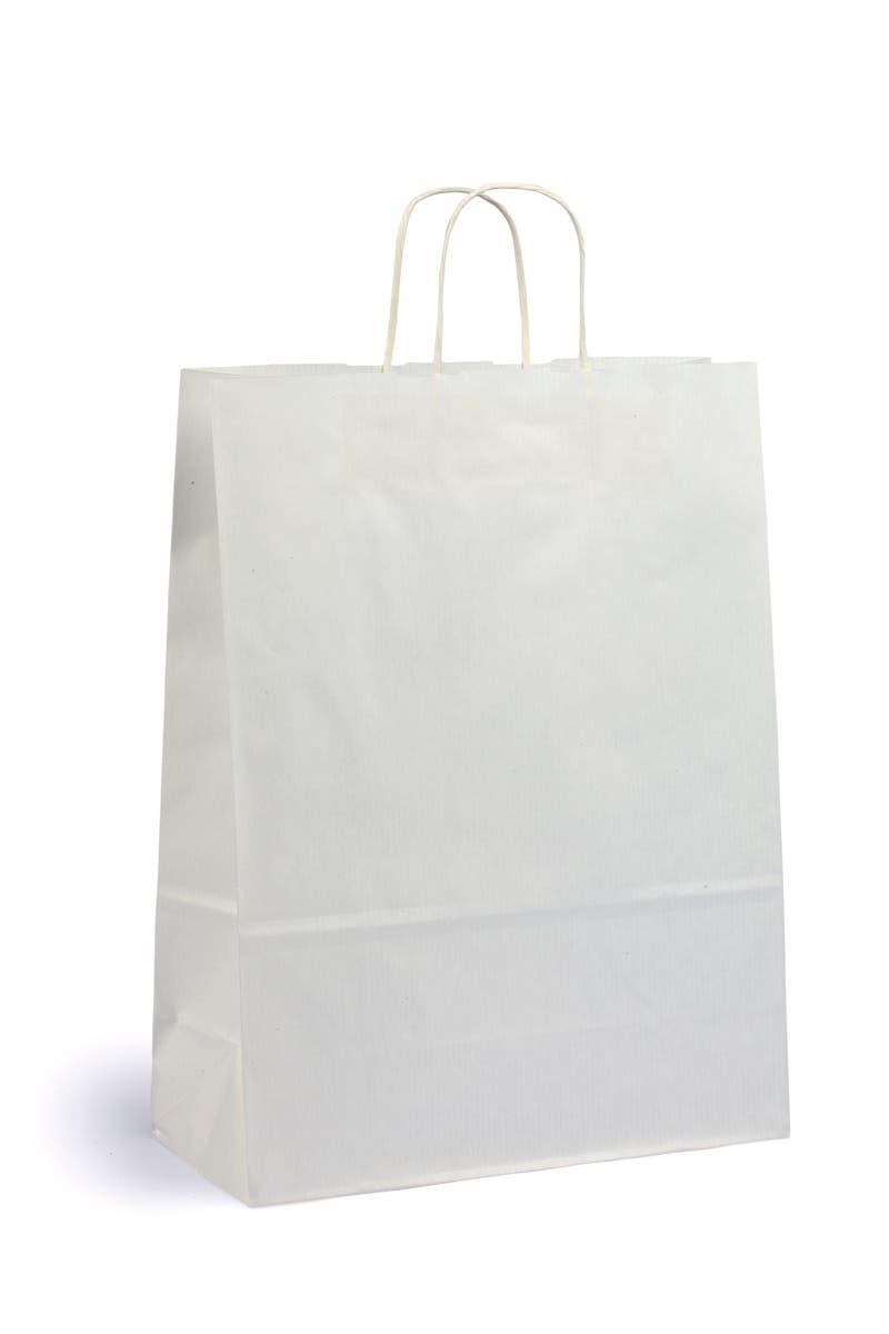 Sober papperskasse M med handtag av tvinnat papper. Bärkassarna har en extra förstärkt botten och är högkvalitativa.