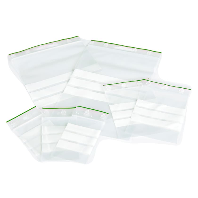Blixtlåspåsar med tre skrivfält och utstansade hål för upphängning. Förslutningsbara zip-påsar för förvaring av mindre saker. Enkelt att sortera ut olika sorter var för sig. Påsarna går att öppna och stänga flera gånger.