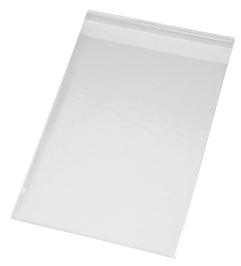Klar cellofanpåse med klisterremsa. Måttet anger utvändigt mått när påsen är stängd.