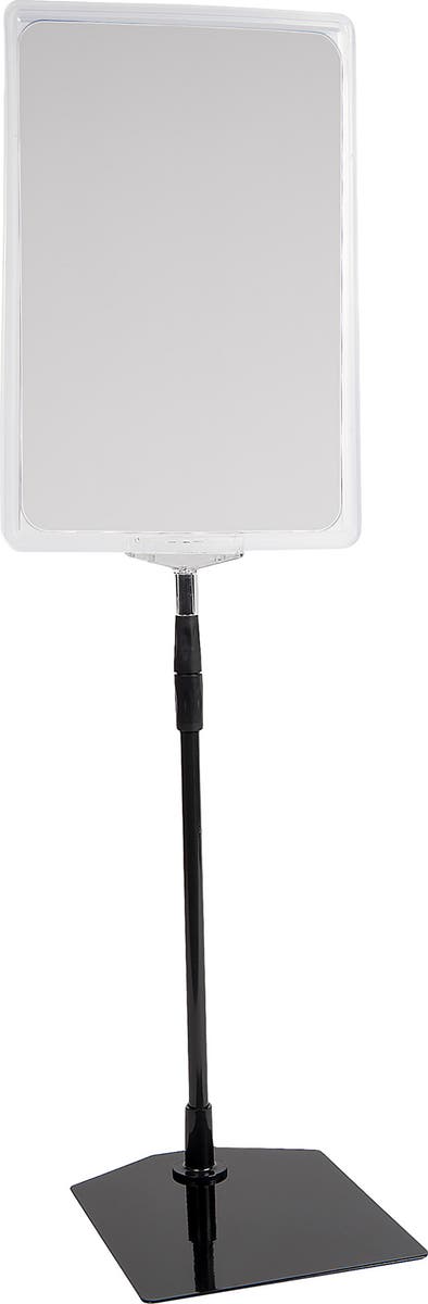 Affischram av plast för A4-format, exkl. ficka. Prisramen har en teleskopisk funktion med en justerbar höjd mellan 30 och 60 cm. Infostället har en stadig fot i metall. Lätt att byta till nytt budskap. Passar bra i butiker för information om olika varor.